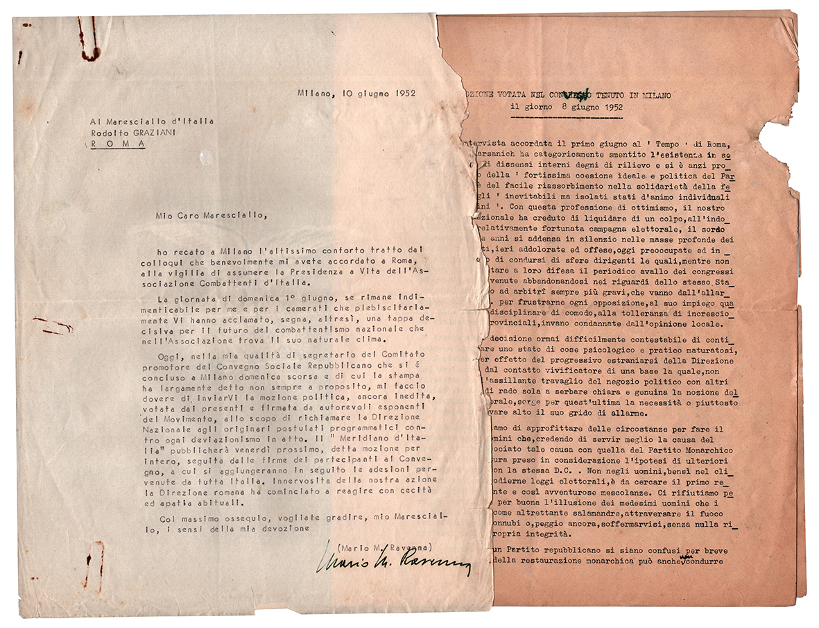 Lettera dattiloscritta firmata di Mario M. Ravenna (segretario del comitato promotore del Convegno Sociale Repubblicano, legionario in Africa Orientale 1935-1937) datata Milano 10 giugno 1952, diretta a Graziani, nella quale gli comunica che i camerati, lo hanno acclamato presidente a vita dell'Associazione Nazionale Combattenti d'Italia. Una pagina in-4, margine destro sciupato. È accluso documento dattiloscritto (con correzioni manoscritte) contenente la trascrizione di una mozione politica del M.S.I. votata l'8 giugno 1952 a Milano. Lacune al margine destro ledono parte del testo. Negli anni '50 l'ex Maresciallo d'Italia aveva aderito al Movimento sociale italiano, del quale divenne presidente onorario nel marzo 1953.