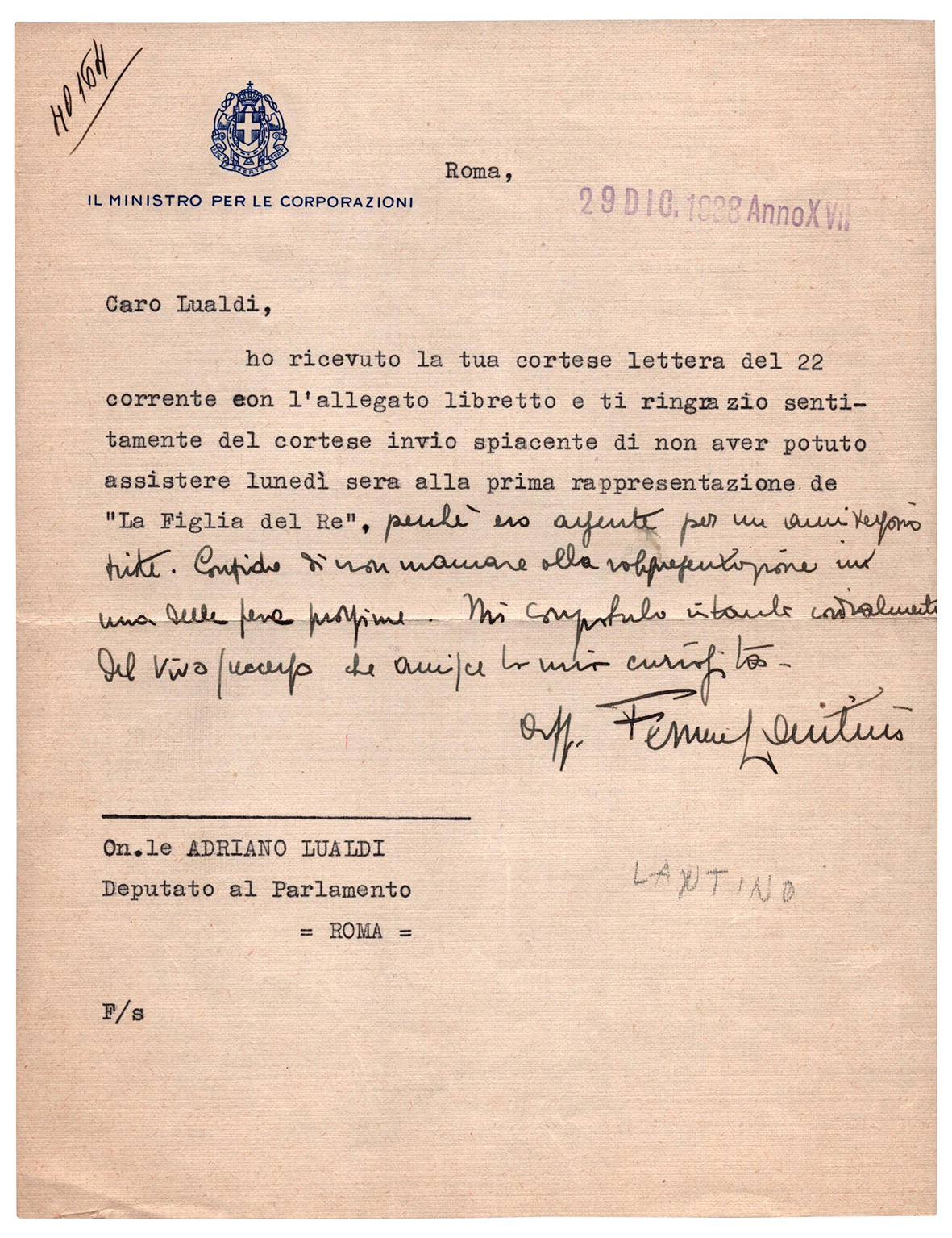 Lettera dattiloscritta con firma e poscritto autografi, datata Roma 29 dicembre 1938 Anno XVIII dell'uomo politico fascista, ministro delle Corporazioni del Regno d'Italia dal 1936 al 1939, diretta al maestro Adriano Lualdi, nella quale si rammarica per non aver potuto assistere alla "prima rappresentazione de 'La figlia del Re'...". Una pagina in-8, su carta intestata.