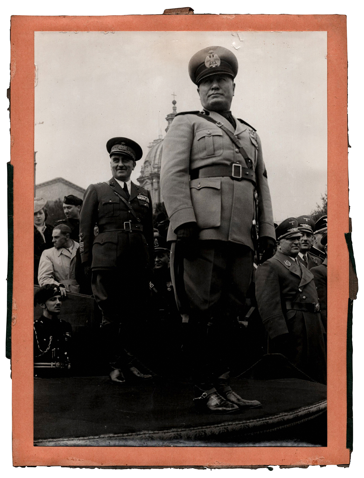 Istantanea (22 x 15,5 cm - applicata su passepartout) del Duce, immortalato a Roma nel 1940 durante un'adunata con ufficiali italiani e tedeschi.