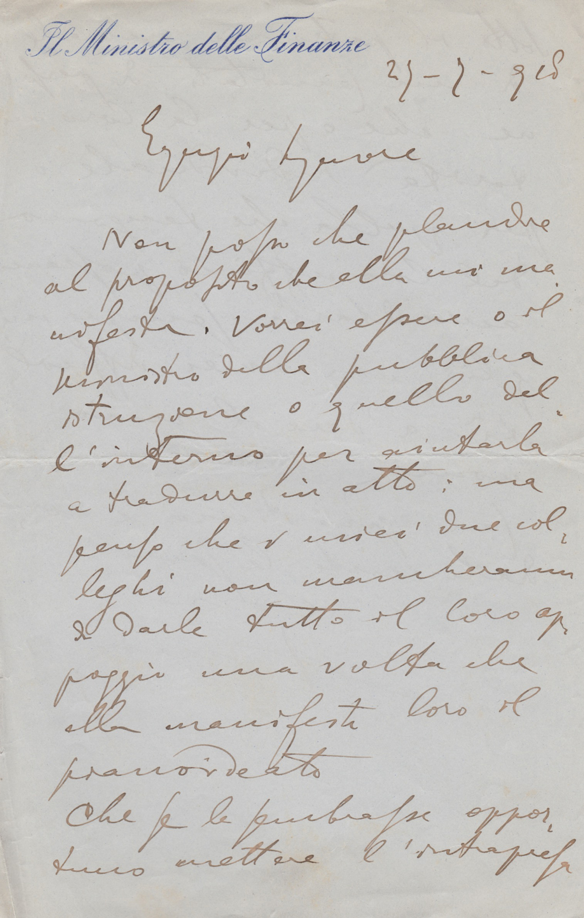 Illustre uomo politico, banchiere e giornalista, fra i massimi esponenti del movimento cattolico italiano tra XIX e XX sec., fu ministro delle Finanze dal 1916 al 1919 e ministro del Tesoro nel biennio 1920-21. Ebbe un ruolo centrale nel riportare l'elettorato cattolico nella vita politica italiana. Lettera autografa firmata, datata 27.7.1918 diretta al maestro Giovanni Tebaldini (1864-1952). "Non posso che plaudire al proposito che ella mi manifesta. Vorrei essere il ministro della pubblica istruzione o quello dell'interno per aiutarla a tradurre in atto: ma penso che i miei due colleghi non mancheranno di darle tutto il loro appoggio...". Due pagine in-8, carta intestata.