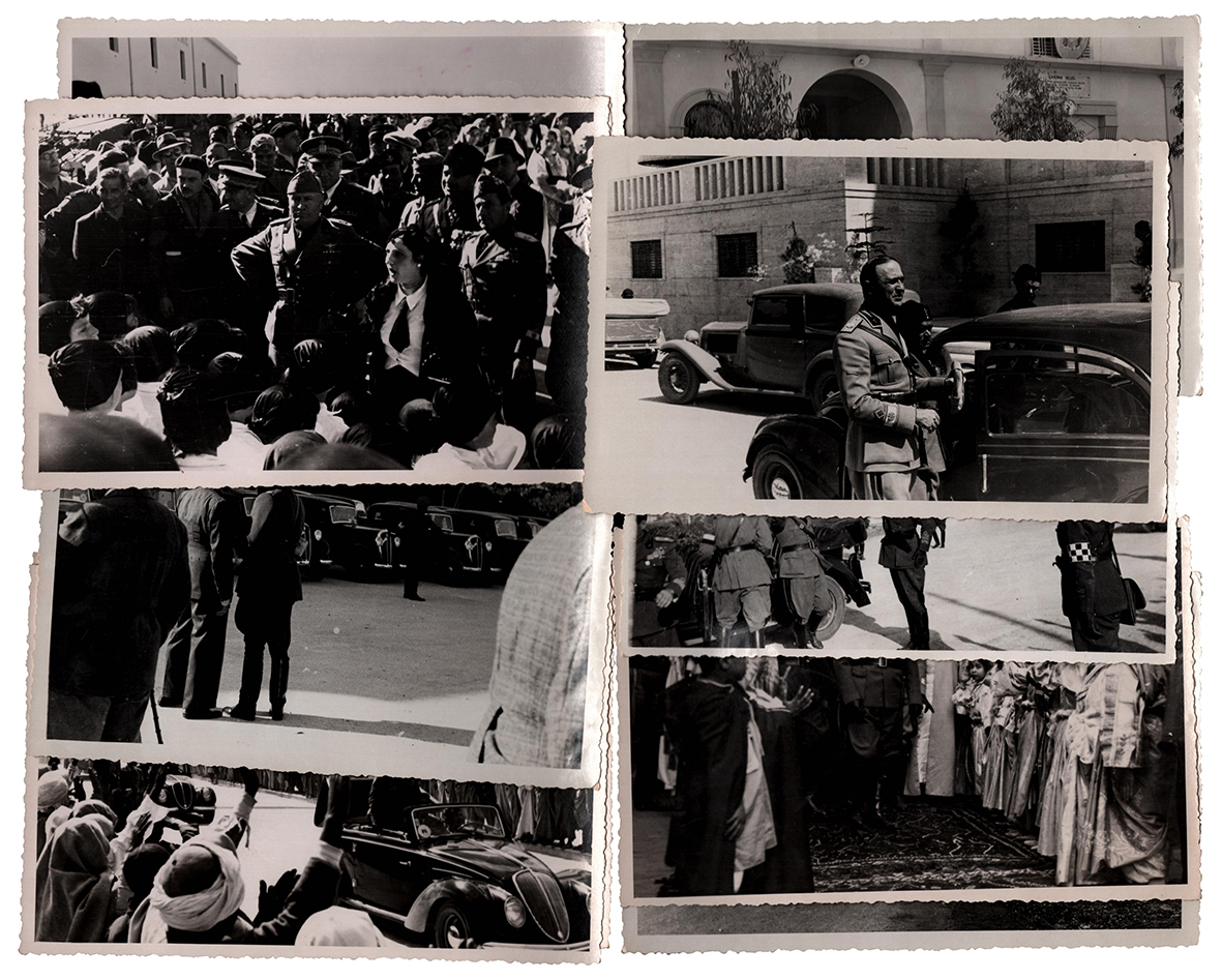 Insieme di undici istantanee relative ad una visita del Duce in Libia, immortalato assieme a vari gerarchi fascisti, tra i quali il governatore Italo Balbo. Il 18 marzo 1937 Mussolini era sbarcato a Tobruk dall'incrociatore 'Pola' per inaugurare la via Balbia, che attraversava tutta la costa libica. La visita durò fino al 21 e vide Mussolini percorrere vaste zone della Libia con l'aereo e l'auto.