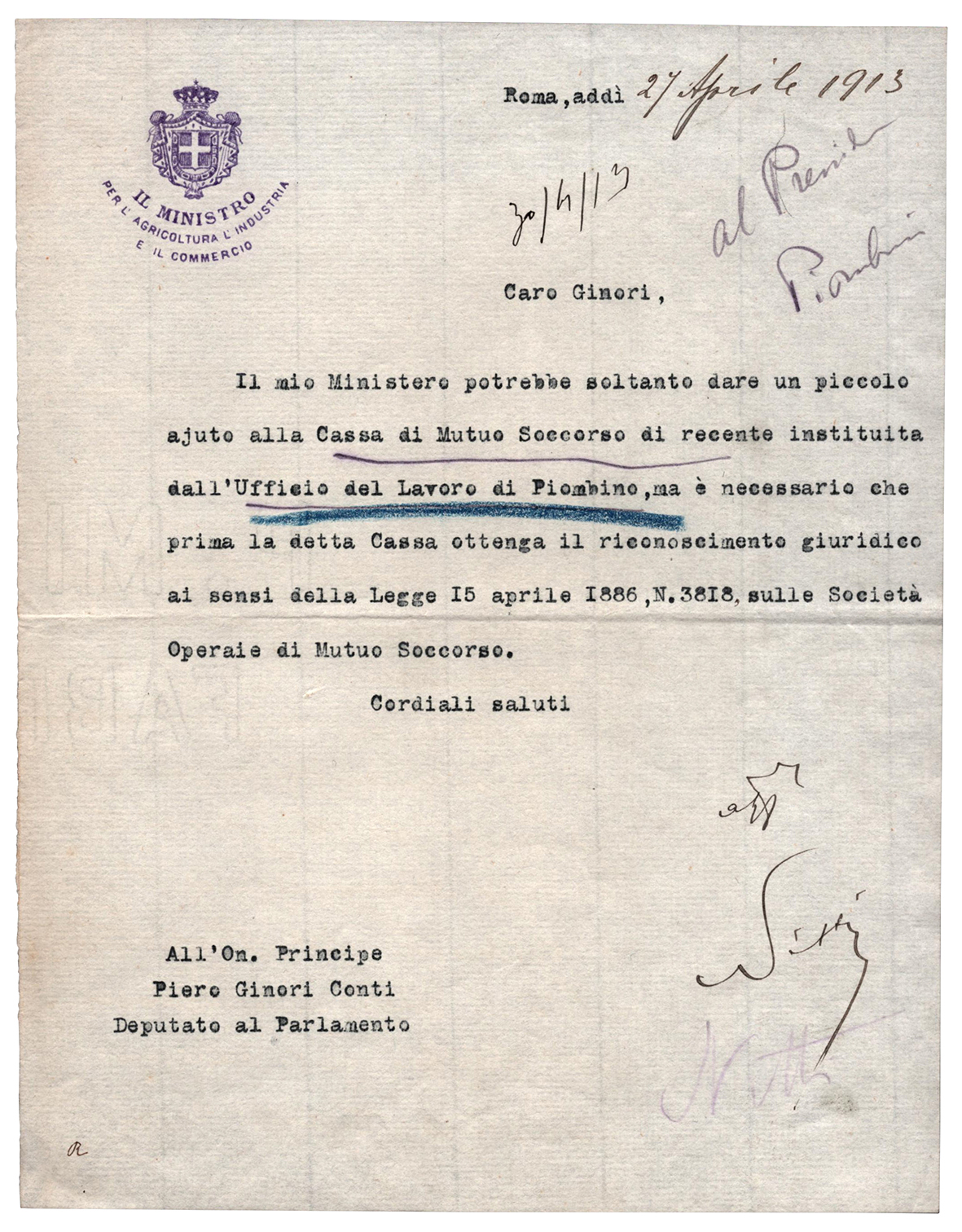 La lettera è diretta al Principe Piero Ginori Conti, circa un aiuto economico in favore della Cassa di Mutuo Soccorso di Piombino. "Il mio ministero potrebbe soltanto dare un piccolo contributo alla Cassa di Mutuo Soccorso di recente istituita dall'Ufficio del Lavoro di Piombino...". Una pagina in-8, su carta intestata. Sottolineature di altra mano a penna e a matita blu. Nitti ebbe sempre grande interesse per la condizione operaia. Nel 1888 pubblicò il saggio 'L'emigrazione italiana e i suoi avversari'. Mentre esponeneti politici come Giolitti e De Gasperi, diedero la fiducia a Mussolini, Nitti si rifiutò di riconoscere la legittimità del governo fascista, iniziando ad essere vittima di intimidazioni fasciste. Mussolini, non avendo digerito il dissenso di Nitti, inivò un gruppo di squadristi che minacciarono lui e la sua famiglia, inducendoli a prendere la via dell'esilio. Nel 1943 fu arrestato dalla Gestapo a Tolsa e fu deportato in Austria. Dopo la fine della seconda guerra mondiale tornò nella sua amata Italia e morì nel 1953 a Roma.