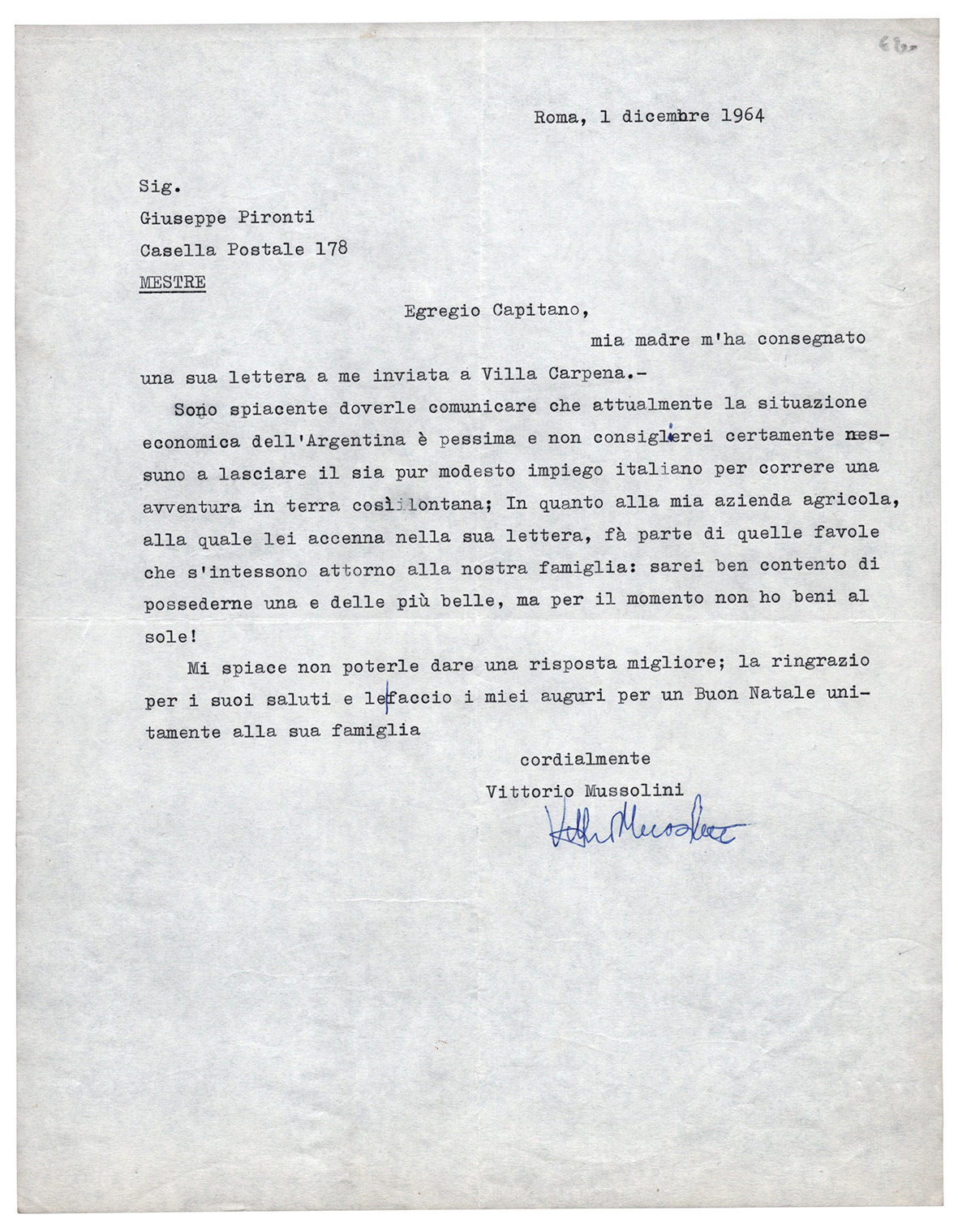 Secondogenito del Duce, sceneggiatore e produttore cinematografico anche conosciuto con lo pseudonimo Tito Silvio Mursino (anagramma del suo nome e cognome) fu direttore della rivista 'Cinema'. Dopo il 25 luglio 1943 si rifugiò in Germania, dove costituì, sotto l'egida tedesca, un governo fascista provvisorio. Dopo l'8 settembre con Alessandro Pavolini e Renato Ricci, cominciò a diffondere, dalla Germania, appelli radiofonici in Italia. Durante la Repubblica si Salò, fu a capo delle segreterie del padre. Alla fine della guerra si imbarcò clandestinamente per l’Argentina dove visse - senza più occuparsi di cinema - fino al 1967, anno in cui rientrò definitivamente in Italia. Lettera dattiloscritta firmata, datata Roma 1 dicembre 1964 diretta al capitano Giuseppe Pironti. "Sono spiacente doverle comunicare che attualmente la situazione economica dell'Argentina è pessima e non consiglierei certamente nessuno a lasciare il sia pur modesto impiego italiano per correre una avventura in terra così lontana; in quanto alla mia azienda agricola, alla quale lei accenna nella sua lettera, fà parte di quelle favole che s'intessono attorno alla nostra famiglia: sarei ben contento di possederne una e delle più belle, ma per il momento non ho beni al sole!...". Una pagina in-4.