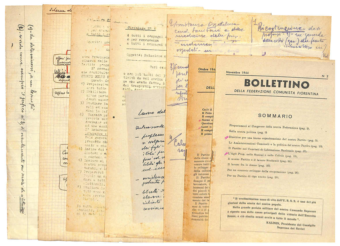 Ampio insieme di documenti (manoscritti, dattiloscritti e a stampa) risalenti al 1943-45 relativi all'attività politica e militare della sezione fiorentina del PCI durante la guerra di Liberazione. Si tratta di documenti di vario genere prodotti dalla federazione comunista fiorentina: corrispondenza, circolari, bollettini, brevi saggi di analisi politica. Per un totale di oltre 100 pagine in vario formato. Sono acclusi ritagli di giornale d'epoca.