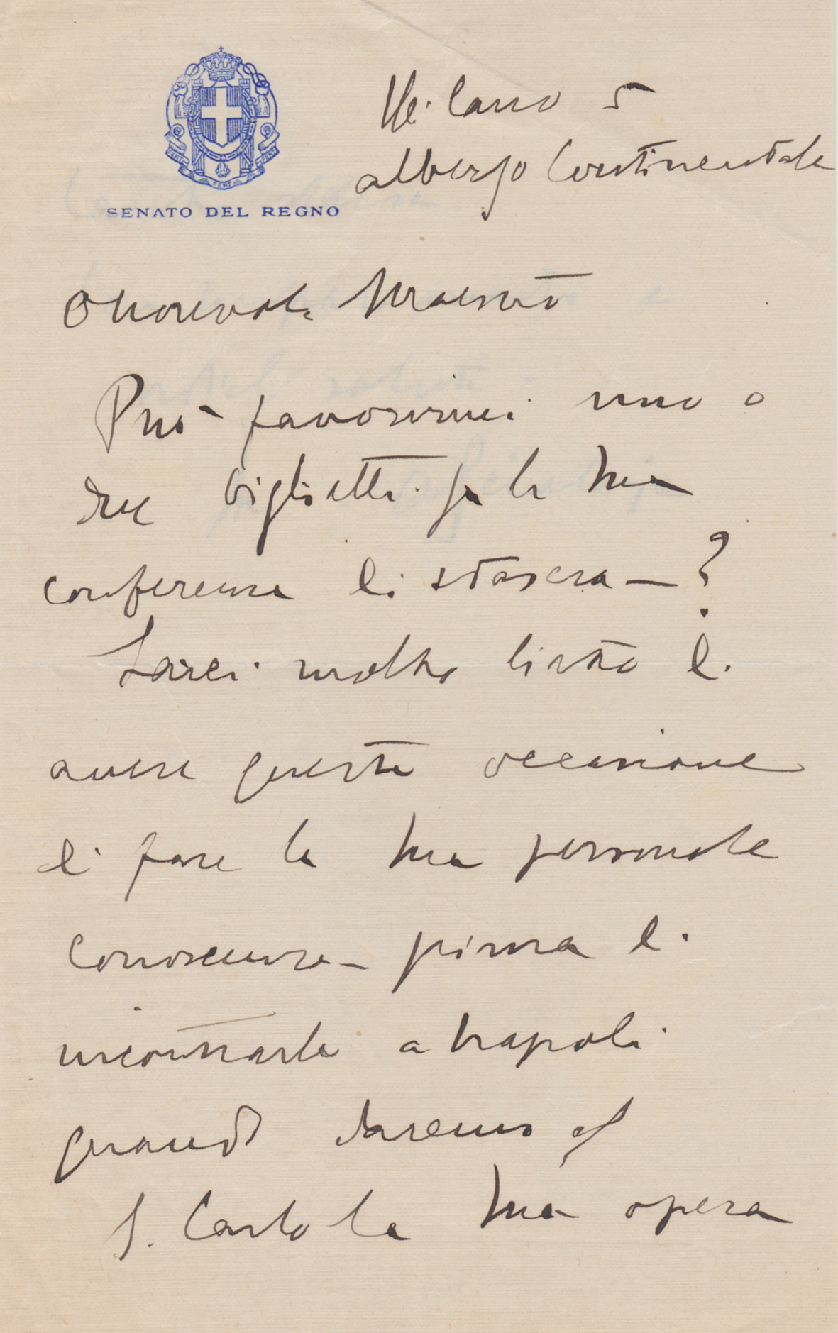 Lettera autografa firmata, datata 'Milano 5 Albergo Continentale' (senza data cronica) di Antonio Scialoja, giurista e politico. Si laurea in giurisprudenza e diviene nel 1911 professore ordinario di diritto commerciale all'Università di Siena. È per tre volte deputato del Regno d'Italia (1913, 1919 e 1924) ed entra poi al Senato nel 1929. Viene deferito il 7 agosto 1944 all'Alta corte di giustizia per le sanzioni contro il fascismo con l'accusa di essere tra i 'senatori ritenuti responsabili di aver mantenuto il fascismo e resa possibile la guerra sia coi loro voti, sia con azioni individuali, tra cui la propaganda esercitata fuori e dentro il Senato'. Antonio Scialoja fu tra i fondatori della AS Roma e ne fu presidente nel 1935. Nella missiva richiede al corrispondente: "uno o due biglietti per la sua conferenza di stasera". Due pagine in-8, su bifolio, carta intestata.