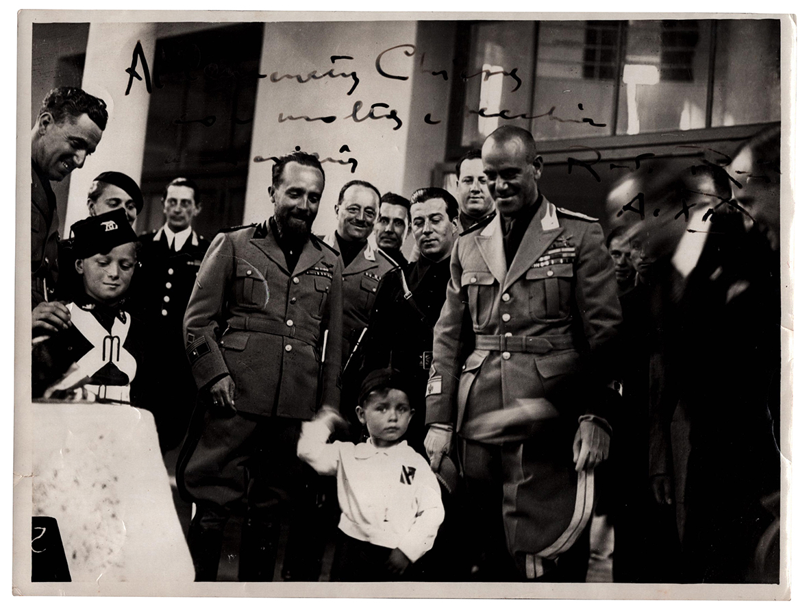 Autografo su fotografia del politico e militare italiano Renato Ricci, rappresentato con alcuni figli della lupa e balilla. Ministro delle corporazioni durante il Regno d'Italia dal 31 ottobre 1939 al 5 febbraio 1943, precedentemente Presidente dell'Opera Nazionale Balilla dal 1926 al 1937, Ricci, con l'avvento della Repubblica Sociale Italiana, fu Comandante della Guardia Nazionale Repubblicana fino al 1944. Dopo il diploma di ragioneria si arruolò volontario nel 1915 nei bersaglieri con il grado di tenente nella prima guerra mondiale, partecipando a tutta la guerra e meritandosi due Medaglie al Valore ed una Croce al merito di guerra. Squadrista convinto, aderì al Partito Nazionale Fascista (PNF) nel maggio del 1921 ed un mese dopo fondò il Fascio della sua Carrara. La sua rapida scalata politica gli fece conseguire la nomina di Commissario per l'Ente Portuale di Carrara e la sovraintendenza all'attività dell'estrazione e del commercio dei marmi. Nel dicembre 1925 Mussolini diede a Ricci la guida del movimento giovanile del PNF (l'Avanguardia giovanile fascista). Poco dopo fu presidente dell'Opera nazionale balilla (ONB) fondata nel 1926. Nei programmi di Benito Mussolini la figura di Renato Ricci occupava una posizione di rilievo per l'attuazione di un vasto programma di coordinamento, formazione e controllo della gioventù italiana. Mussolini, che riteneva fondamentale la formazione politica e fisica del "cittadino-soldato", concepì a questo scopo l'Opera nazionale balilla (ONB), inquadrandovi ragazzi, anche giovanissimi, nel tentativo di ostacolare altre influenti organizzazioni giovanili in espansione come l'Azione Cattolica e gli scout. Sotto la supervisione di Ricci, i balilla e gli avanguardisti furono sottoposti al più ampio esperimento di educazione di Stato e di irreggimentazione che l'Italia abbia conosciuto. Questo esperimento portò nel giro di un decennio alla costruzione di centinaia di Case del balilla, investendo l'intero territorio nazionale ed arrivando a contare oltre tre milioni di giovani iscritti.