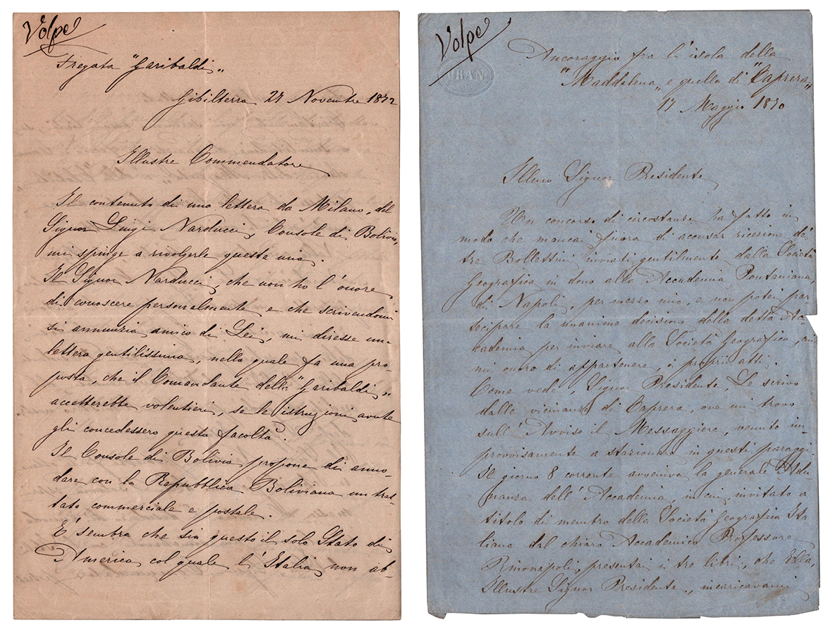 Due lettere autografe firmate, datate rispettivamente al 1870 e 1872 di Raffaele Volpe, Capitano di Vascello della Regia Marina Italiana, al comando dell'ariete torpediniere Giovanni Bausan, dirette al geografo Cristoforo Negri, circa il progetto di stipulare un trattato commerciale con la Bolivia: "Il Console di Bolivia propone di annodare con la Repubblica Boliviana un trattato commerciale e postale. E' sembra che sia il solo stato di America col quale l'Italia non abbia un qualsiasi trattato. Certamente noi saremmo assai lieti, se, a similitudine di quanto già fecero i Comandanti della Magenta e della Clotilde potesse il nostro Comandante avere anch'egli la occasione di trattare. Nella circostanza attuale, il Signor Narducci e Lei, Signor Commendatore, potrebbero, io penso, preparare l'autorizzazione necessaria, il primo avvalendosi delle sue relazioni personali col Presidente della Bolivia, ed Ella avvalendosi del credito che gode presso il Ministero nostro degli Affari Esteri...". Per un totale di otto pagine in-8.
