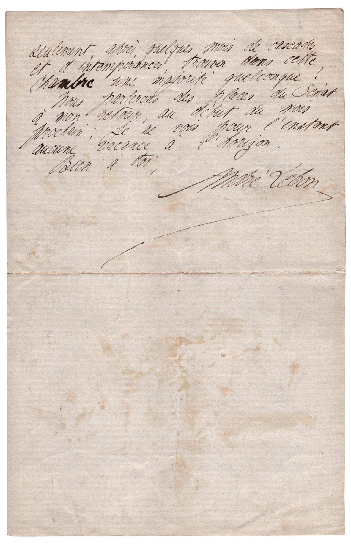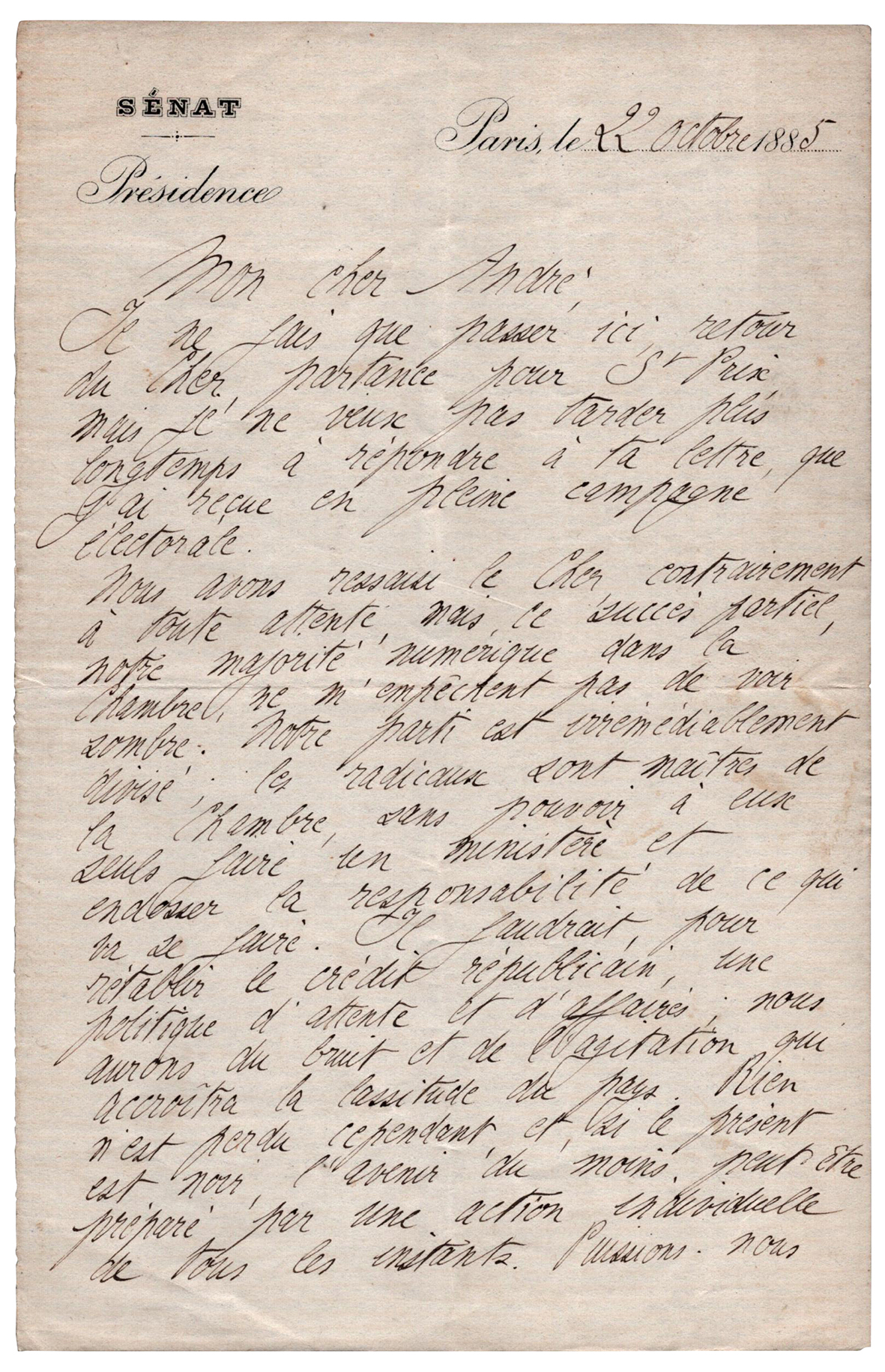 Lettera autografa firmata datata Paris le 22 octobre 1885 dell'uomo politico, docente e uomo d'affari noto anche con il nom de plume di André Daniel, nella quale comunica al corrispondente le proprie preoccupazioni circa la situazione del loro partito. "Mais le succès partiel, notre majorité numerique dans la chambre, ne mì émpechent pas de voir sombre. Notre parti est irrémédiablement divisé: les radicaux sont maitres de la Chambre...". Una pagina e mezza in-8, su carta intestata 'Sénat - Présidence'.