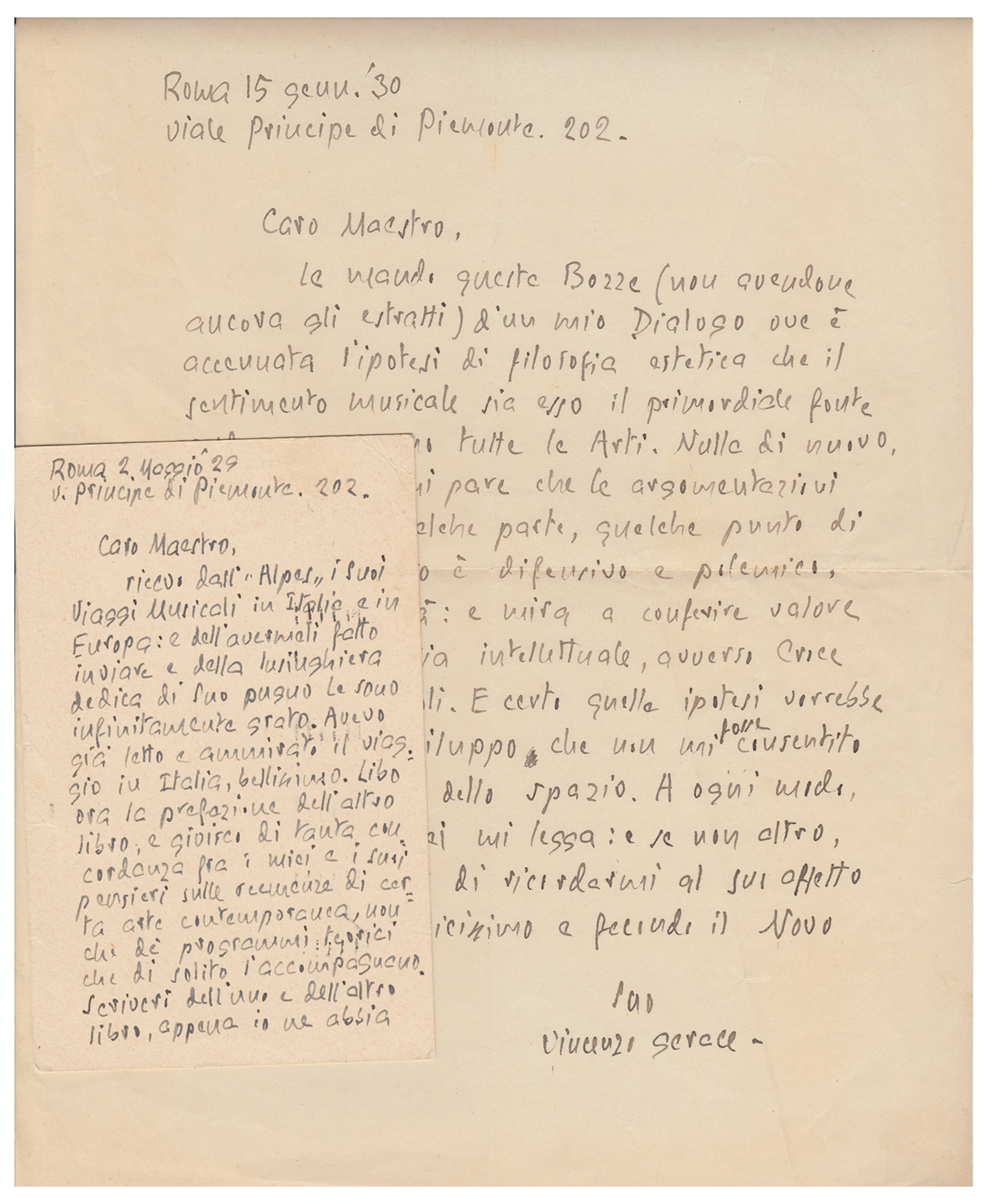 Due lettere autografe firmate (una su cartolina postale viaggiata) datate al 1929 e al 1930, dello scrittore e giornalista, Vincenzo Gerace, intimo di Benedetto Croce, entrambe dirette al musicista Adriano Lualdi, su questioni editoriali: "Le mando queste Bozze (non avendone ancora gli estratti) d'un mio Dialogo ove è accennata l'ipotesi di filosofia estetica che il sentimento musicale sia esso il primordiale fonte onde promanano tutte le Arti...". Tre pagine in diverso formato.
