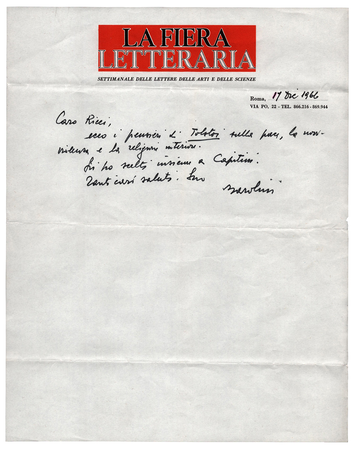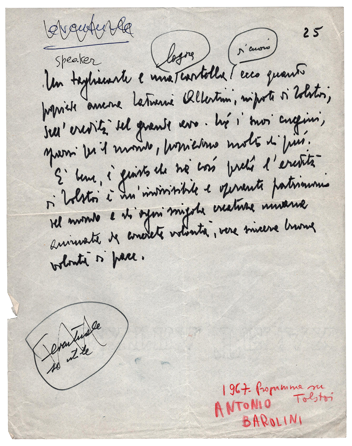 Manoscritto autografo dello scrittore, poeta e giornalista, corrispondente dagli Stati Uniti per 'La Stampa', Antonio Barolini. Esordì come poeta nel 1930 con un volume pubblicato a sue spese 'Cinque canti'; nel 1938 uscì 'La gaia gioventù', permeato da un'aura religiosa che si approfondì nelle successive raccolte in versi. Accanto all'attività di poeta Antonio Barolini svolse quella di giornalista e di narratore. Nell’ultima fase della sua vita, diresse la più importante trasmissione letteraria della Rai degli anni Sessanta, 'L'approdo'. Nella missiva si legge: "Un tagliacarte e una logora cartella di cuoio, ecco quanto possiede ancora (...) Albertini, nipote di Tolstoi, dell'eredità del grande avo...". "l'eredità di Tolstoi è un'indivisibile e (...) patrimonio del mondo e di ogni singola creatura umana animata da concreta volontà, vera sincera buona volontà di pace...". E’ unita una lettera autografa firmata, 'datata 17 dic. 1966' relativa al suddetto articolo, 'pensieri di Lev Tolstoi sulla pace'. Una pagina in-4, carta intestata 'La fiera letteraria'.