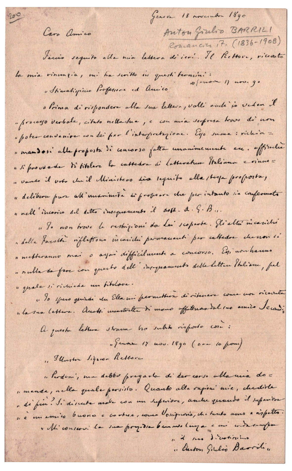 Lunga lettera autografa firmata, datata 'Genova 18 novembre 1890' del narratore, fondatore del quotidiano 'Il Caffaro' nel 1875 e rettore dell'Ateneo di Genova nel 1903, Anton Giulio Barrili. Barrili combatté al fianco di Giuseppe Garibaldi in Trentino nel 1866, come volontario nell'8º Reggimento del Corpo Volontari Italiani. Nel 1894, grazie al sostegno di Giosuè Carducci, ottenne la cattedra di Letteratura italiana all'Università di Genova; fu nominato rettore nel 1903. La missiva è relativa ad una controversia sorta con il consiglio di facoltà e col Rettore Riccardo Secondi dell'Università di Genova, circa la promulgazione di un concorso per la cattedra di Letteratura Italiana: "Ed ora, per dimostrare a te che io non ho dato corpo alle ombre, come sembra al signor Rettore, eccoti testuale il famoso rendiconto ch'io seguito a stimare poco riguardoso per il Ministero e scortese con me: 'Adunanza del consiglio di facoltà del 21 giugno 1890'. Il Consiglio si aduna alle 3 pom. coll'intervento dei professori...". "Il due dicembre, a cui si richiamano i tre ordinarii parve un piccolo colpo di stato allo stesso ministero, che a suo tempo non tralasciò di rispondere che il Governo sapeva benissimo quel che doveva fare senza che altri s'arbitrasse d'insegnarglielo. Il ricordare sotto la data del 21 giugno 1890 il voto del 2 dicembre 1889 non è un rinnovare quella prima mancanza di riguardo? non è un mostrare sfiducia verso l'autorità superiore...". Quattro pagine in-8, fittamente vergate.