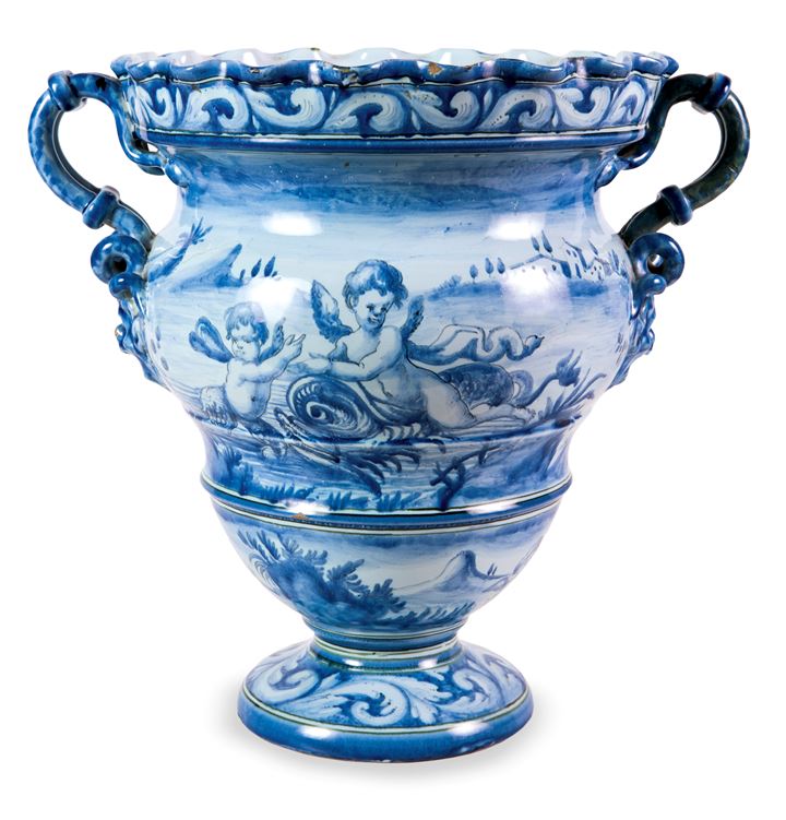 Vaso in ceramica dipinta, nei toni del bianco e del blu, raffiguranti putti alati