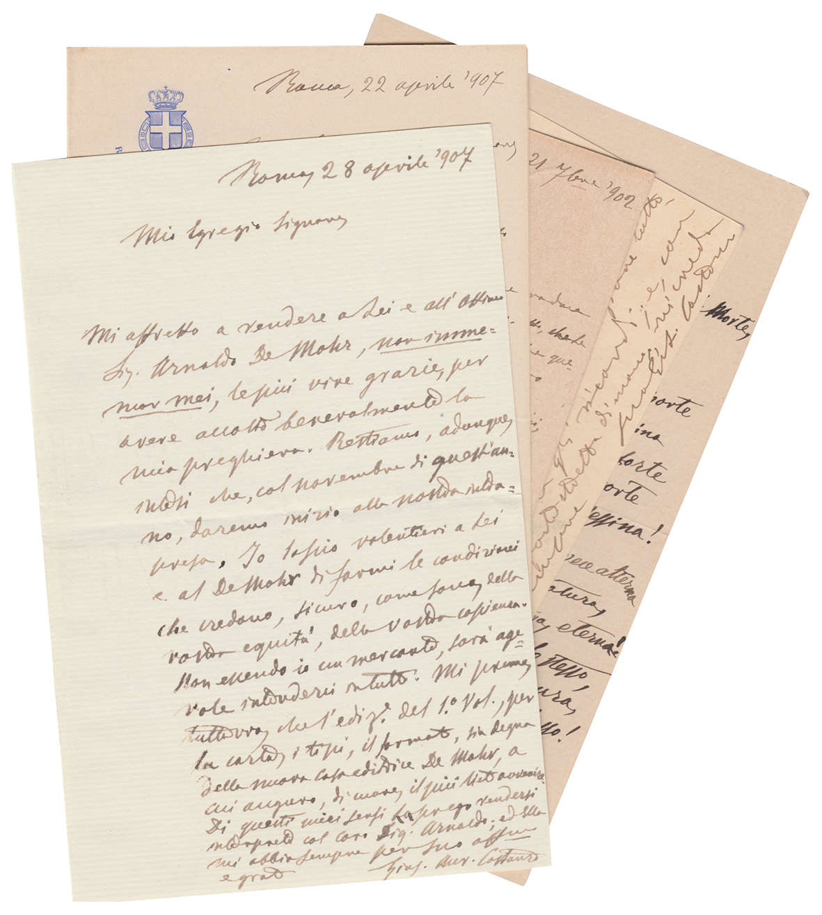 Carteggio costituito da cinque lettere autografe e firmate dal letterato e poeta italiano Giuseppe Aurelio Costanzo. Nel 1869 fu chiamato dal Ministero della Pubblica Istruzione all'insegnamento delle lettere italiane al Liceo di Cosenza. Partecipò insieme ad altri, ad un volume commemorativo sullo Zola, pochi mesi dopo la morte ('Per Emile Zola', numero unico a cura di Salvatore Rago, Avellino, Tip, Pergola, 7 dicembre 1902). Costanzo fu anche Segretario particolare dei ministri Correnti (1872) e Perez (1879); fu iniziato in Massoneria nella loggia romana Propaganda massonica del Grande Oriente d'Italia nel 1889. Le missive datate tra il 1907 e il 1902 vertono su questioni editoriali, riportiamo un passo: "Mi affretto a rendee a Lei e all.. Sig. Arnaldo De Mohr... le più vive grazie, per aver accolto benevolmente la mia preghiera..." "...la carta.. il formato siano degni della nuova casa editrice De Mohr..".