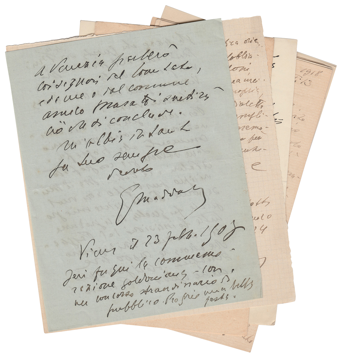 Carteggio costituito da otto lettere autografe firmate di Edgardo Maddalena, letterato e patriota dalmata, docente di letteratura tedesca presso l'Istituto di magistero di Firenze (1915), noto studioso di Carlo Goldoni. Risalenti all'arco cronologico 1907-1921, le lettere sono dirette a Vittorio Scotti e Giorgio Barini - quest'ultimo, illustre musicologo, su questioni letterarie. Riportiamo per esempio un passo: "Grazie infinitamente delle linee sempre affettuose, e la copia della preziosa lettera Goldoniana che mi favorisce tanto generosamente. Scovare oggi lettere del Nostro è fortuna grandissima. Sono più rare che mai, e mi rallegro sinceramente con lei della buona ventura...". Per un totale di trentadue pagine in-8, sono accluse alcune buste. E' unito scritto autografo firmato su Carlo Goldoni e la lingua veneta (una pagina in-8).
