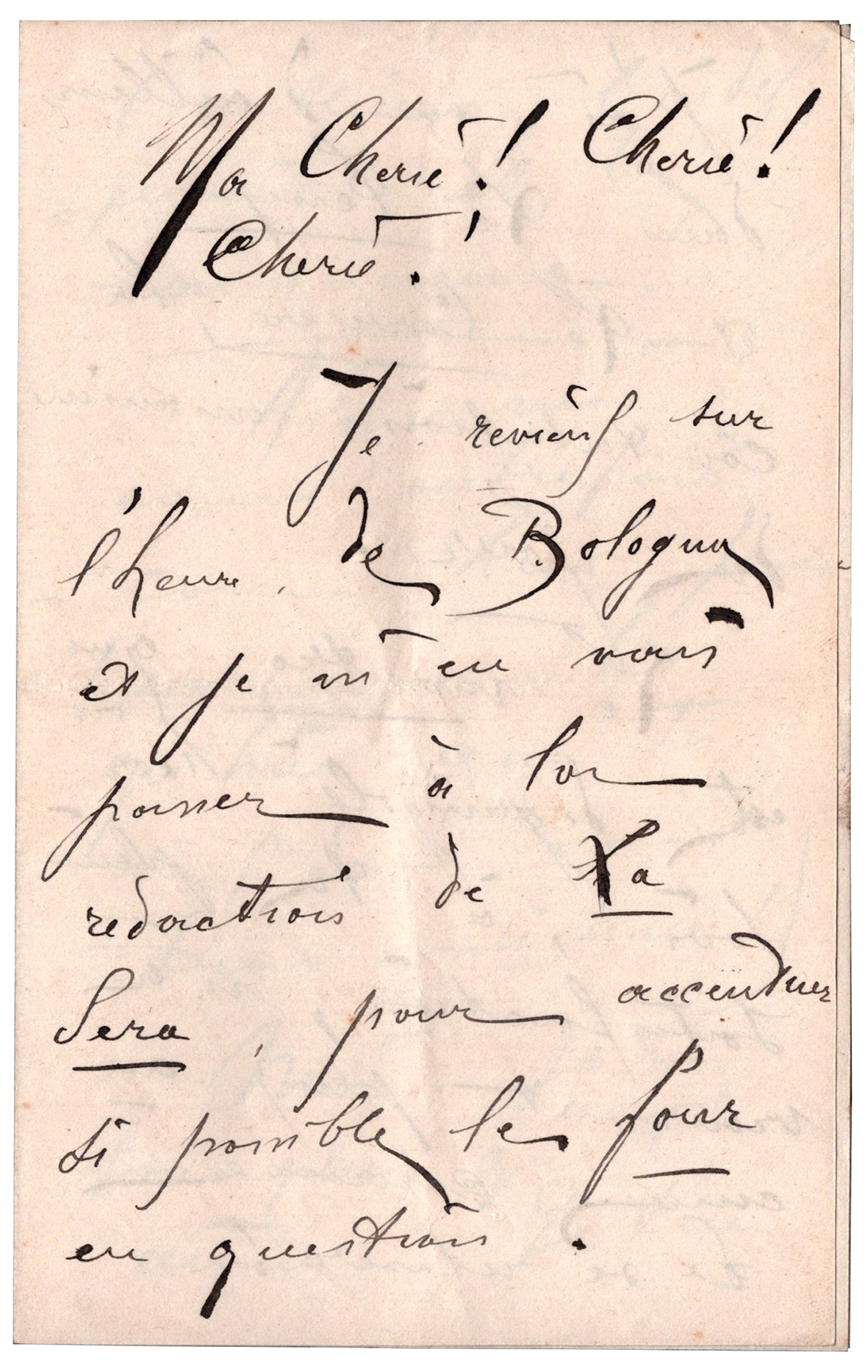 Bella e lunga lettera autografa firmata (8 pagine), senza indicazione di data, del fondatore del Futurismo, Filippo Tommaso Marinetti, diretta a Severina Javelli, con la quale aveva intrecciato una relazione sentimentale. Marinetti scrisse molte lettere alla Javelli nel biennio 1901-1902; ventisei anni lui, trentasei anni lei, i due si incontrarono più volte soprattutto a Genova, dove la cantante tenne alcuni concerti. Riportiamo alcuni passi: "Tu me dit que le temps des répétitions va commencer. Qu'importe? je viendrai quand même, ne fût-ce que pour te voir un instant et te donner un baiser, (divines lèvres de mon rêve!), e te dire une fois de plus que je n'aime rien au monde, rien, rien, si ce n'est ma Severina! (...). "Je ne sais plus que t'aimer. Je t'embrasse bien follement de tout l'élan desesperé d'un plongeur-suicide dans le gouffre...". Otto pagine in-8, su 2 bifolii.