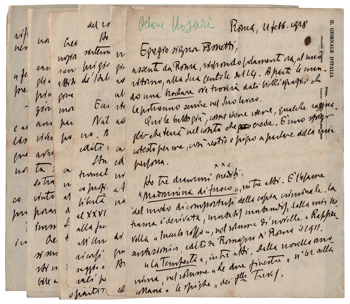 Lettera autografa firmata, datata 'Roma 21 febbraio 1928' dello scrittore e giornalista, collaboratore de 'La Tribuna', 'L'Idea Nazionale' ed 'Il Giornale d'Italia', inviato speciale che seguì la prima trasvolata atlantica di Italo Balbo, circa alcune opere che intende pubblicare: "Ho tre drammi inediti. "Madonnina di fuoco", in tre atti. E' l'esame del modo di comportarsi della coppia criminale. La trama è derivata, mutatis mutandis, dalla mia novella "Incubo Rosso', nel volume di novelle 'Rappresentazioni', edito da Romagna di Roma il 1911...". otto pagine in-8, su carta intestata 'Il Giornale d'Italia'.