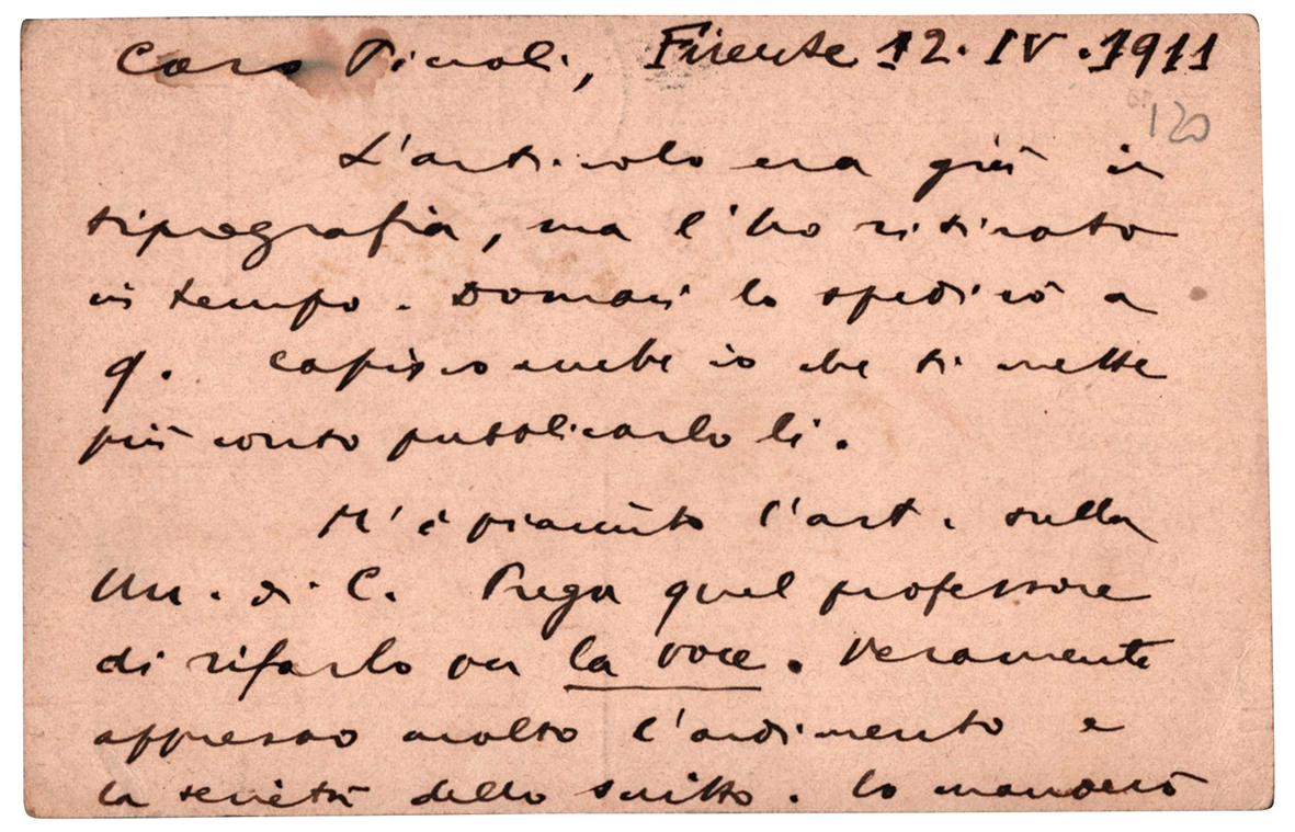 Cartolina postale autografa firmata, datata 'Firenze 12.IV.1911', a Raffaello Piccoli (letterato napoletano, 1886-1933, docente di Letteratura Italiana a Cambridge), evidentemente riguardante un pezzo inviato alla 'La Voce': "l'articolo era già in tipografia, ma l'ho ritirato in tempo". Nel 1908 fonda 'La Voce', rivista da lui diretta fino al novembre 1914 e che durante la sua esistenza (verrà pubblicata fino al 1916) spazierà su temi legati a letteratura, politica e società. Tra il 1910 e il 1911 esce la prima serie (tredici volumi) dei "Quaderni della Voce", ispirati per contenuti e veste tipografica ai Cahiers de la Quinzaine di Charles Péguy. Il 1911 è l'anno dell'attacco dell'Italia alla Libia. Sin dai primi mesi appaiono vari articoli sull'argomento su 'La Voce'. La posizione iniziale di Prezzolini è antinazionalista. Nei mesi successivi cambia progressivamente idea, fino a decidere di appoggiare la Campagna di Libia. Nello stesso anno la casa editrice dei "Quaderni della Voce" chiude l'attività. Prezzolini, volendo continuare la pubblicazione dei volumi, a novembre fonda la 'Libreria della Voce', casa editrice gestita dallo stesso gruppo di intellettuali della rivista: è il suo esordio nel settore dell'editoria.
