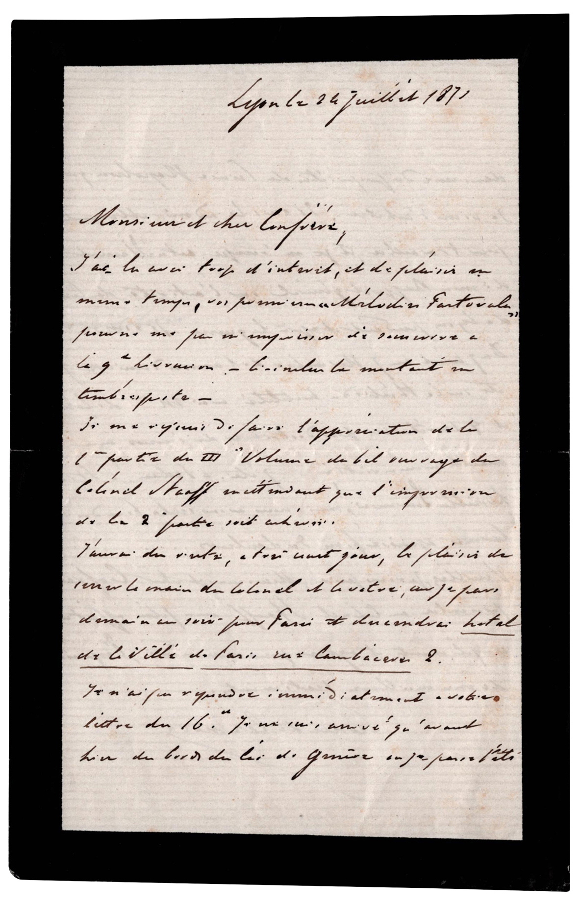 Lettera autografa firmata, datata '24 juillet 1871' (firmata con altro pseudonimo), diretta al poeta francese Thalès Bernard (1821-1873) su questioni letterarie: "J'ai lu avec trop d'intérêt, et de plaisir en même temps, vos premières 'Mélodies Pastorales'...".Due pagine in-8, carta listata di nero. Gustavo Strafforello svolse la sua attività di scrittore per molti anni a Torino, prima nel giornalismo, poi collaborando assiduamente a grandi opere enciclopediche ('Enciclopedia Pomba'; 'Brockhaus's Conversations-Lexikon') e traducendo dall'inglese e dal tedesco numerose opere fra cui il notissimo 'Self-Help di S. Smiles' ('Chi s'aiuta Dio l'aiuta', Milano 1865). In molte sue opere usò vari pseudonimi, tra cui Spiritus Asper e Iunius Redivivus.