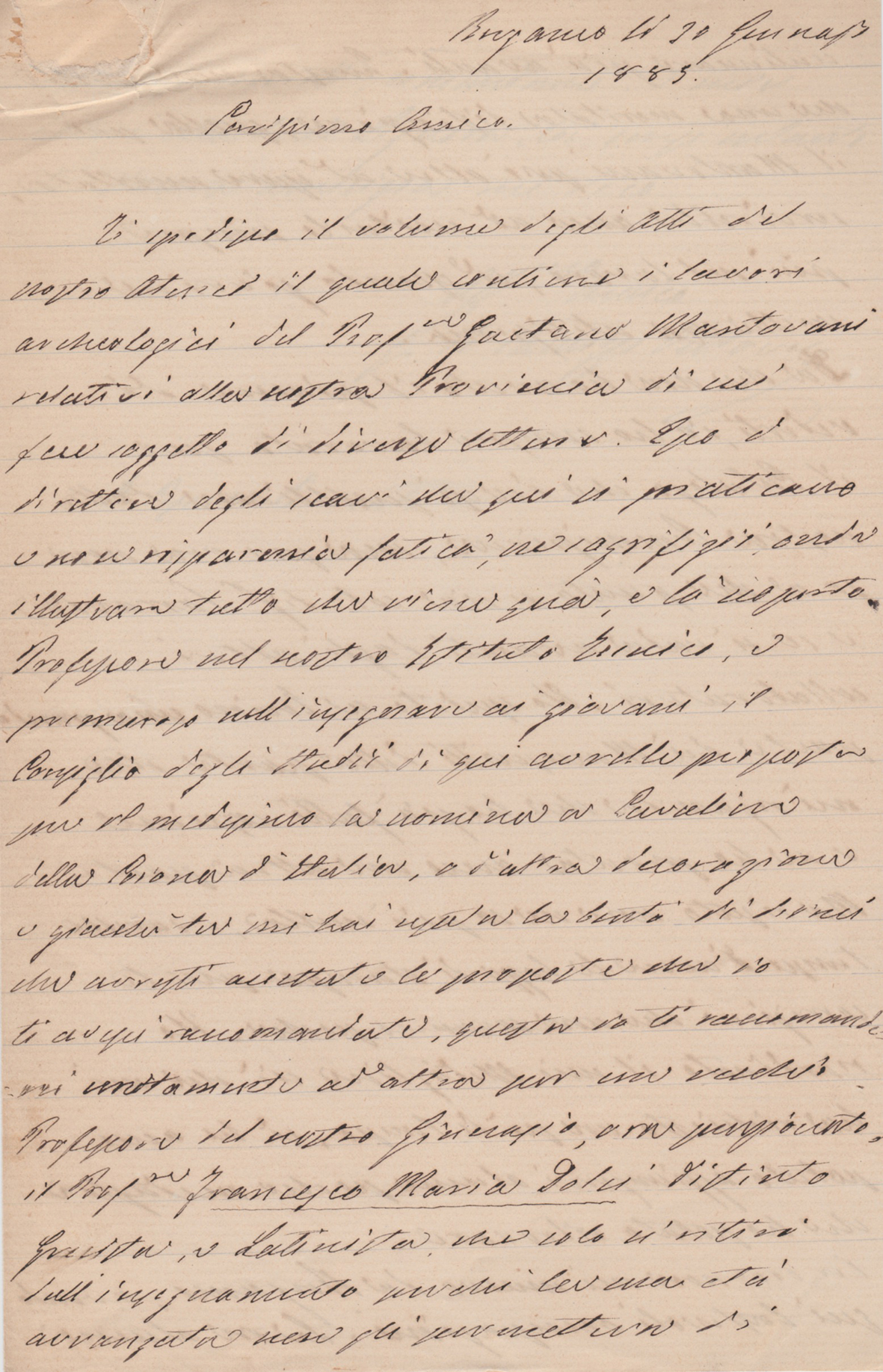 Lettera autografa firmata, datata "Bergamo li 20 Gennaio 1885" dell'imprenditore, patriota e uomo politico, sindaco di Bergamo dal 1860 al 1870 e senatore del Regno d'Italia dal 1861, circa alcune iniziative culturali relative alla storia di Bergamo. "Ti spedisco il volume degli Atti del nostro Ateneo il quale contiene i lavori archeologici del Prof. Gaetano Mantovani relativi alla nostra Provincia di cui fece oggetto di diverse letture. Esso è direttore degli scavi che qui si praticano e non risparmia fatica né sagrifizii...". Tre pagine in-8, su bifolio. Lieve lacuna al margine superiore, non lede il testo. E' unita riproduzione a stampa di un ritratto calcografico (su p. in-8).