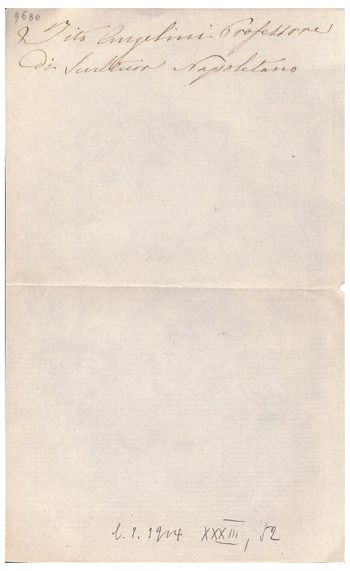 Pagina di liber amicorum (in-8) con firma e rigo di testo autografi del rinomato scultore, direttore della Scuola di disegno di Napoli. "Tito Angelini Professore di scultura napoletano". Datata '1. 9. 1914'. Tito Angelini dopo aver completato i suoi studi a Roma, compì numerosi viaggi in tutta Italia, sebbene la sua attività di scultore lo vide protagonista soprattutto a Napoli dove insegnò scultura e fu direttore della Scuola di disegno. Il successo che conseguì in queste attività didattiche gli fece ricevere numerose commissioni ufficiali di opere come "La Clemenza e L'Immacolata" per lo scalone e la cappella del Palazzo Reale di Napoli. Tra le sue opere più rilevanti vanno ricordate il Sepolcro di Lucia Migliaccio ed il Sepolcro di Michele Arditi nella Chiesa di San Ferdinando, i monumenti a Saverio Mercadante (situato nell'omonima piazza lungo il corso Vittorio Emanuele) e Paolo Emilio Imbriani (in piazza Mazzini), la statua di Sant'Ambrogio per la Chiesa di San Francesco a Gaeta.