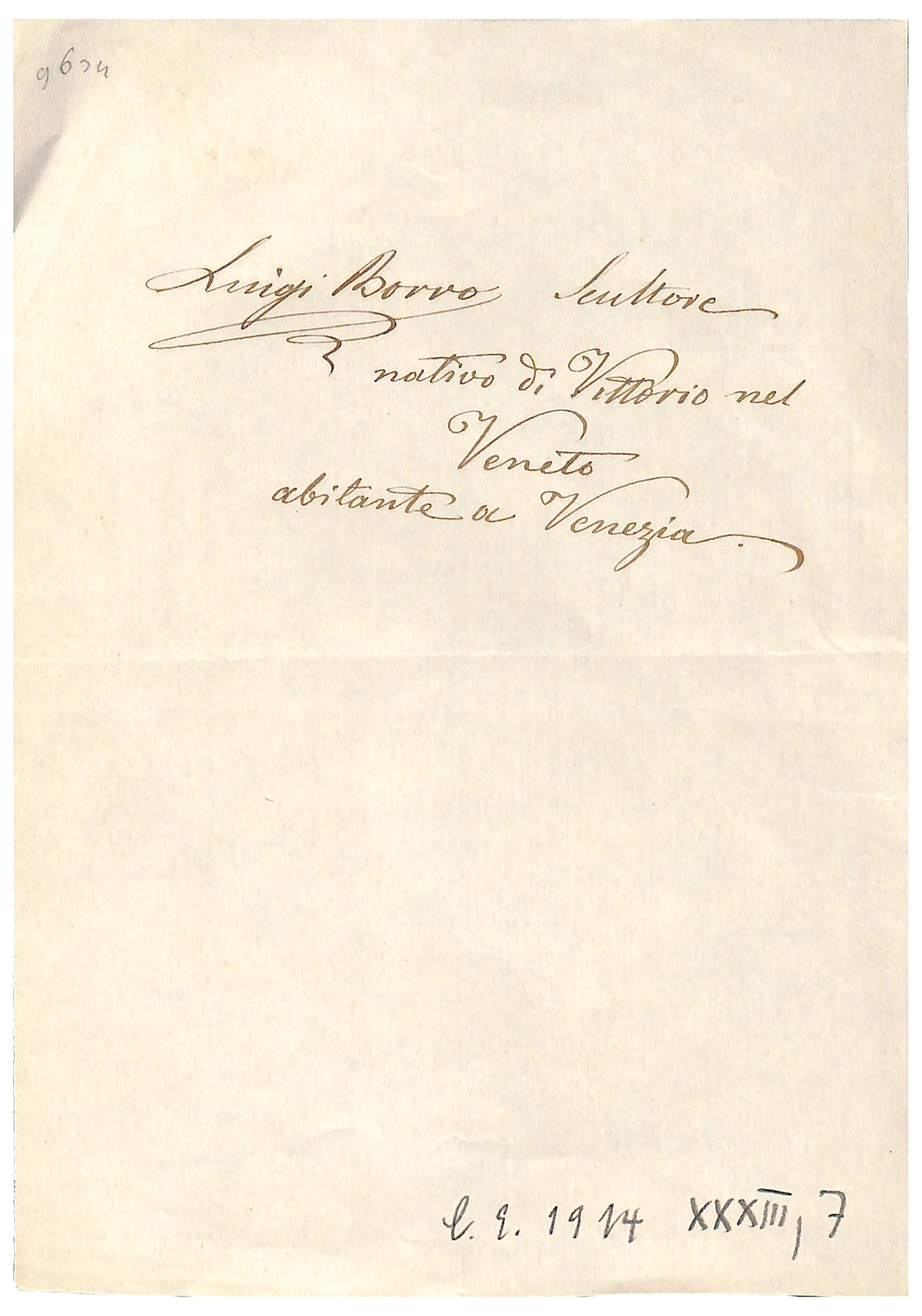 Pagina di liber amicorum (in-8) con firma e righi di testo autografi dello scultore autore del 'Monumento a Daniele Manin' a Venezia: "Luigi Borro. Scultore nativo di Vittorio nel Veneto abitante a Venezia" (1868). E' presente una data a matita di altra mano '1(?) 9. 1914'.