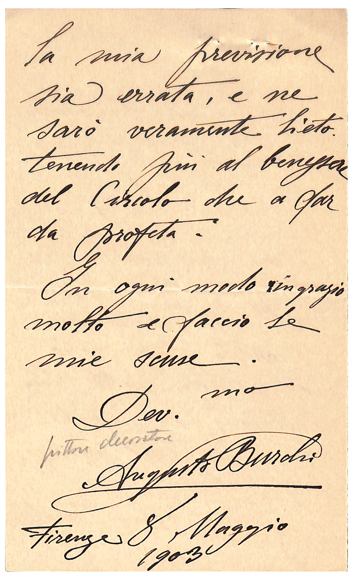 Lettera autografa firmata, datata 'Firenze 8 Maggio 1903' di Augusto Burchi, rinomato pittore, restauratore e decoratore, professore all'Accademia di Belle Arti di Firenze, noto per aver riportato alla luce ed aver restaurato gli affreschi di Lorenzo Monaco nella cappella Bartolini Salimbeni in Santa Trinità a Firenze. La missiva è diretta al segretario del circolo degli artisti di Firenze, nella quale comunica di rinunciare "all'incarico affidatomi", non avendo "molta speranza nella efficacia della Commissione". Due pagine in-8.