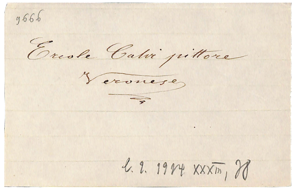 Pagina di liber amicorum (su biglietto) con firma autografa del rinomato pittore veronese Ercole Calvi, tra i principali esponenti della pittura di paesaggio dell'epoca.