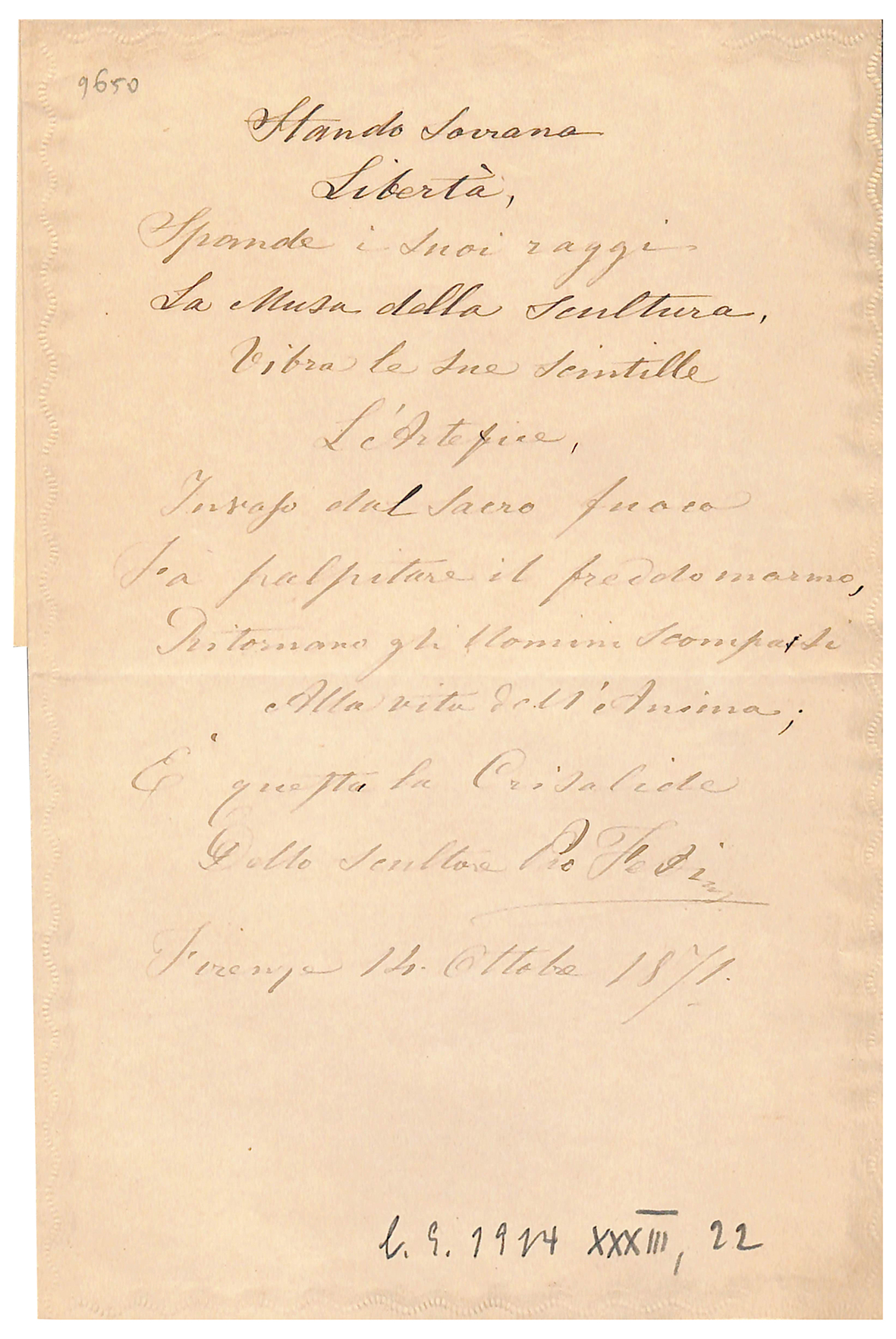 Componimento poetico autografo firmato, datato 'Firenze 14 ottobre 1871' dello scultore autore della statua 'Libertà della Poesia' (Basilica di Santa Croce, Firenze), Pio Fedi. Fin dalla sua gioventù la sua produzione è particolarmente ricca di disegni e bozzetti. Il suo lavoro più noto è il 'Ratto di Polissena', dal vivo dinamismo, unica scultura moderna scelta per figurare nella Loggia della Signoria (1866). Incipit: "Stando Sovrana/Libertà/Spande i suoi raggi/La Musa della scultura/Vibra le sue scintille/L'Artefice/... "Una pagina in-8.