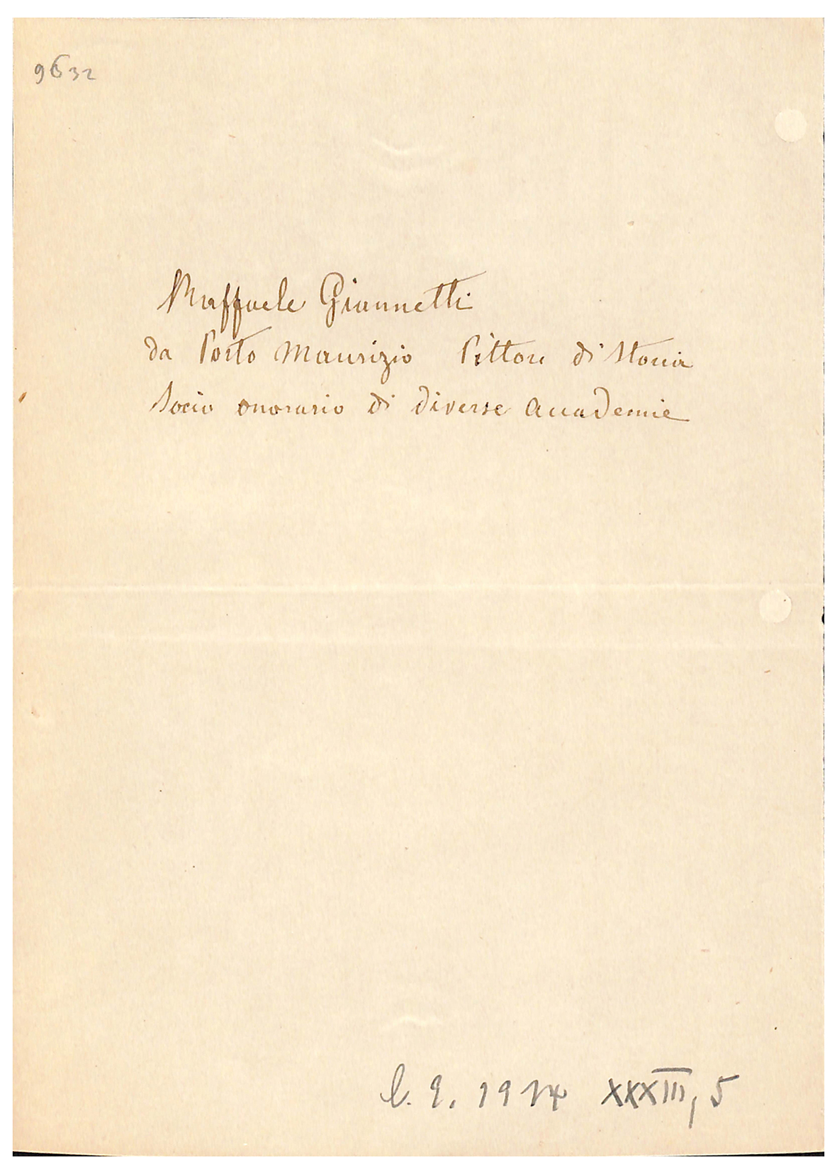 Pagina di liber amicorum (in-8) con righi di testo autografi firmati del rinomato pittore di storia Raffaele Giannetti. Con il dipinto 'Sansone condannato alla macina' nel 1858 esordì alla Promotrice genovese di belle arti, dove inviò regolarmente i propri lavori fino al 1880. L’anno seguente vi prese parte con Il 'Colloquio di Carlo V e Clemente VII'. L’opera inaugurò una serie di tele, spesso di grandi dimensioni, di evidente ispirazione storico-letteraria. Alcune opere sono conservate presso il Gabinetto dei disegni e delle stampe di Palazzo Rosso a Genova.