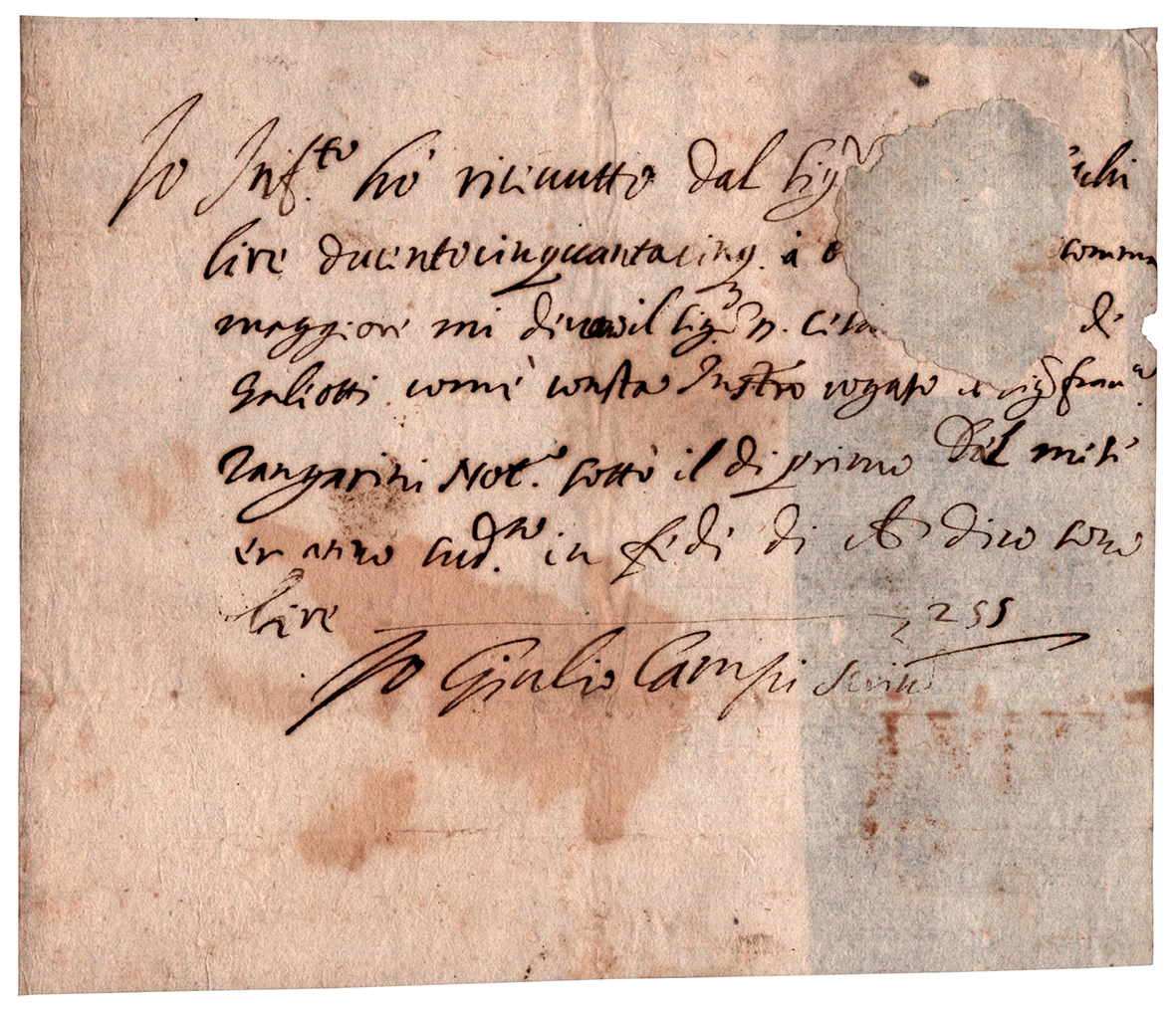 Nel documento l’artista attesta - "Io Giulio Campi scrissi" - di aver ricevuto Lire 255 in apparenza da tale Galiotti in pagamento forse di una commissione.