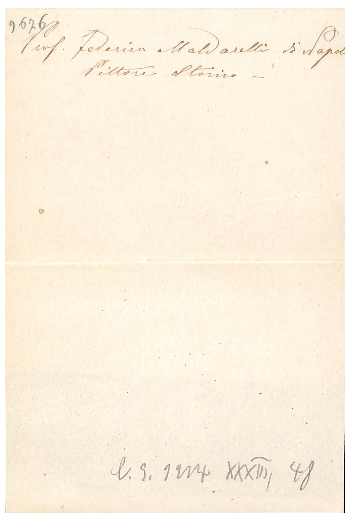 Pagina di liber amicorum (in-8) con righi di testo autografi firmati del rinomato pittore e scultore neoclassico Federico Maldarelli. Tra le sue prime opere pittoriche si annovera una tela raffigurante 'Gesù in casa di Marta e Maria', conservata nella Chiesa di Sant'Antonio da Padova a Caserta e acquistata dal Re Ferdinando II di Borbone, alla biennale Borbonica del 1848, quando Federico era ancora allievo presso il Real Istituto di Belle Arti (Accademia di belle arti di Napoli). Nel 1867 partecipò all'Esposizione universale di Parigi e nel 1880 al 'Salon'.