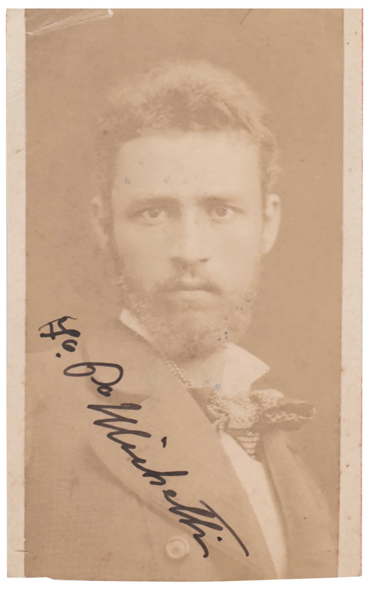 Autografo su ritratto fotografico del rinomato pittore e fotografo Francesco Paolo Michetti. Nel 1872 e poi nel 1875 espose le sue opere al Salon di Parigi, ma venne acclamato, raggiungendo la definitiva fama internazionale, nel 1877, quando espose a Napoli l'eclatante tela del 'Corpus Domini' (acquistata dall'imperatore Guglielmo II di Germania). La sua fama si consolidò con le opere successive: il 'Voto' (1883, Roma, Galleria Nazionale d'Arte Moderna) e 'La figlia di Iorio' il cui tema ispirò anche la più notevole delle tragedie di Gabriele d'Annunzio il quale gli dedicò anche il libro "Il Piacere". Fin dal 1871 Michetti si era anche interessato alla fotografia, inizialmente solo come procedimento per lo studio dal vero dei soggetti dei suoi quadri, poi anche come nuovo ed autonomo mezzo espressivo, valendosi anche di interventi grafici diretti sulle stesse matrici fotografiche.
