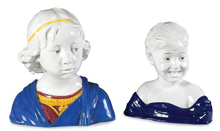Coppia di busti in ceramica dipinta, prima metà XX secolo; uno manifattura Cantagalli, Firenze, l'altro anonimo