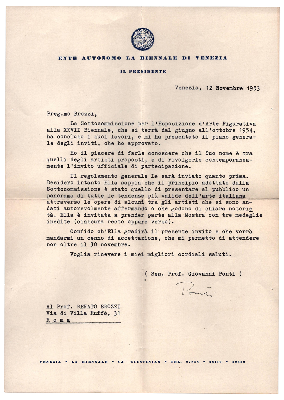 Giovanni Ponti (Venezia 1896 - Padova 1961), Inivito a Renato Brozzi per la Biennale di Venezia