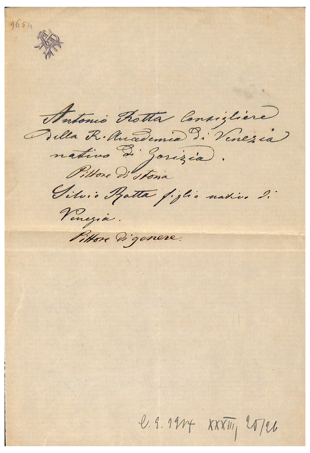 Pagina di liber amicorum (in-8) con righi di testo autografi firmati (breve nota autobiografica) del 'pittore delle Ballate veneziane' o 'poeta di Venezia', noto esponente della pittura di genere Antonio Rotta. Nel 1853 partecipò all'Esposizione di Belle Arti a Milano con il dipinto storico 'Tiziano Vecellio istruisce nella pittura Irene di Spilimbergo'. Nel 1878 vinse il premio dell'esposizione del Salone del Louvre di Parigi. Le sue opere si trovano in numerosi musei in tutto il mondo, al Museo d'Arte di Filadelfia come nei musei di Helsinki e nel Museo Revoltella di Trieste. La sua città natale custodisce molte sue opere, soprattutto ritratti, presso i Musei Provinciali di Storia ed Arte di Gorizia, molte delle sue opere sono state vendute all'estero e si trovano in importanti collezioni private.