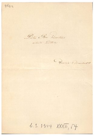 Pagina di liber amicorum (in-8) con righi di testo autografi firmati, datata 'Venezia 3 dicembre 1871' del pittore e patriota vicentino Pietro Roi. A Roma nel 1843, fu influenzato dagli artisti neoclassici e romantici Minardi e Consoni. Dipinse quadri storici, ritratti e paesaggi. Su pagina in-8.