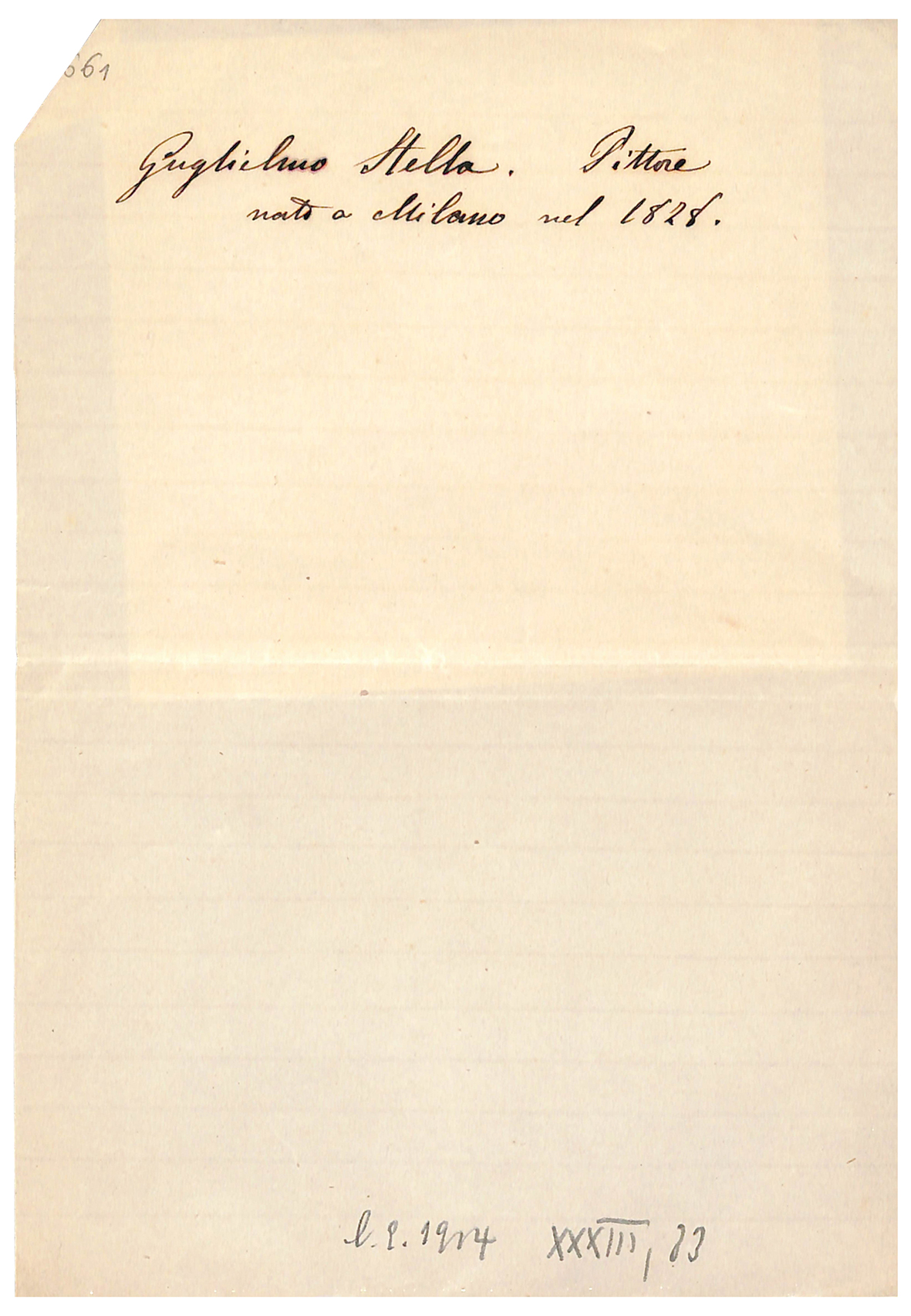 Pagina di liber amicorum (in-8) con righi di testo autografi firmati del pittore Guglielmo Stella. Figlio dell’editore Luigi Stella, si forma da autodidatta tra Milano e Vienna. Dal 1868, Guglielmo Stella inizia ad insegnare figura e composizione decorativa industriale nella Scuola d’Arte Applicate di Venezia. Ne diventa poi direttore per i successivi vent’anni.