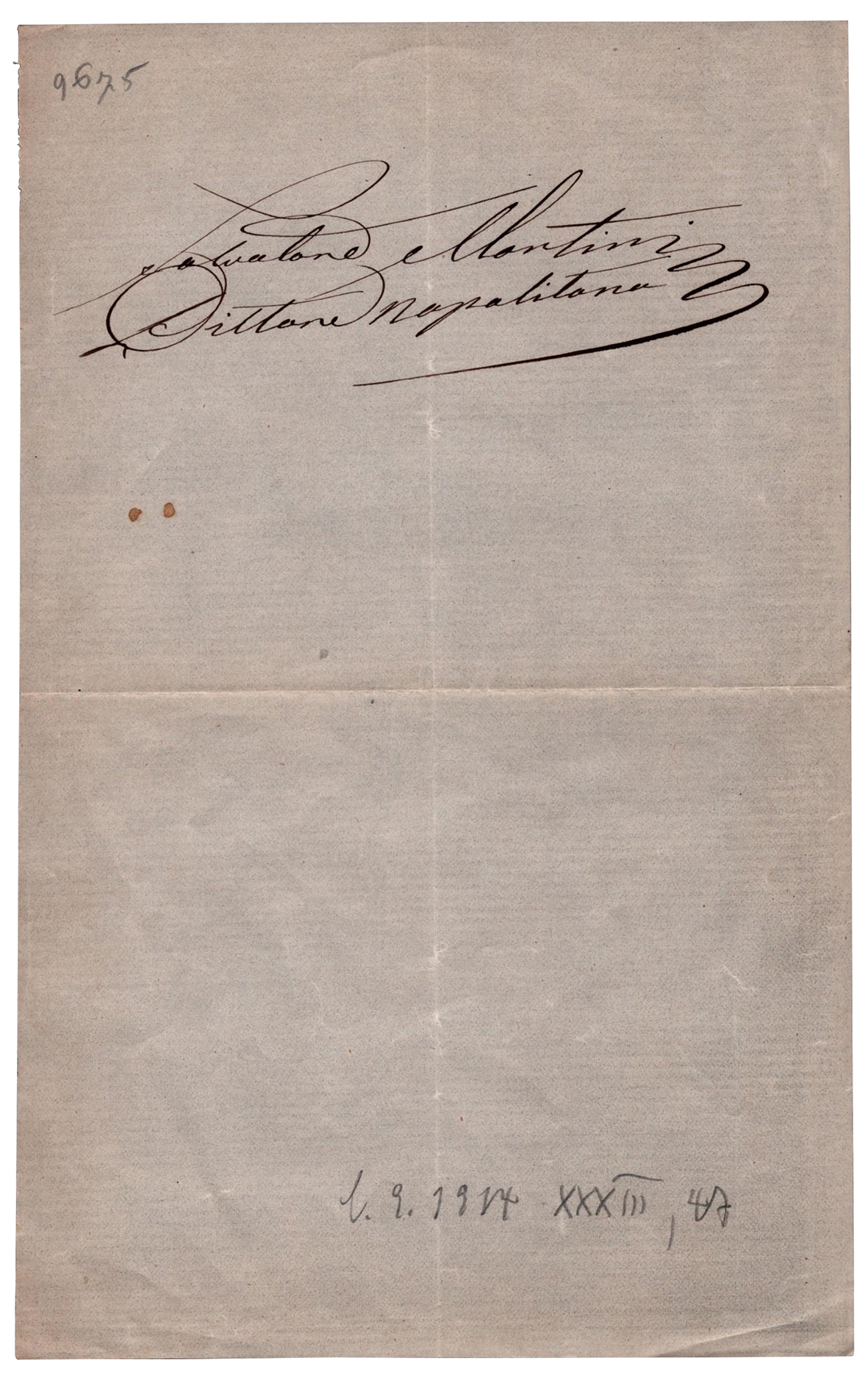 Nato a Lenola, circondario di Gaeta il 23 dicembre 1822 si trasferisce a Napoli da adolescente per frequentare l’Accademia delle Belle Arti. Scultore e pittore, inizia la sua carriera assieme ad artisti come Domenico Morelli ed altri esponenti della Scuola napoletana ottocentesca. Nel 1855 esordisce alla Promoteca borbonica esponendo il quadro 'Il prigioniero di Chillon' in cui è ritratta una scena immaginata da Byron. Espone nel 1862 'Un episodio della peste fiorentina del 1348' e nel 1864 'Eloisa e Abelardo', due opere frutto della specializzazione del Martini per eventi storici. Nell’Esposizione italiana di belle arti di Parma del 1870 espone l’opera 'Arrivo della Pia dè Tolomei alla Maremma toscana', presentata anche a Londra nel 1871. Forse parte di una collezione di autografi, il biglietto reca la firma di Salvatore Martini