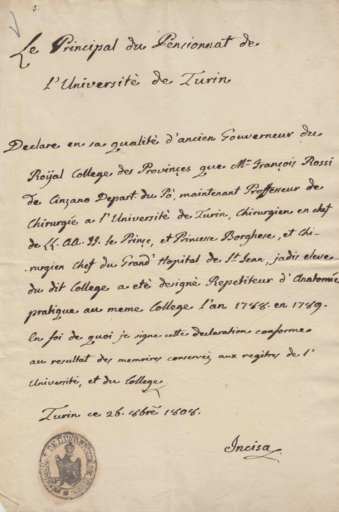 Lettera autografa, datata Turin ce 26 8bre 1808, firmata da "Incisa", "Governeur du Royal College des Provinces". Si dichiara che il dottor "Francois Rossi de Cinzano", chirurgo in capo dei principi Borghese e del grande ospedale di San Giovanni, fu nominato "Repetiteur d'anatomie pratique" di detto collegio per il biennio 1788-89. Una pagina in-4.