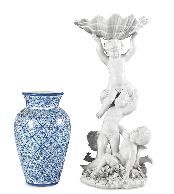 Lotto composto da due oggetti, XX secolo: una scultura in ceramica smaltata raffigurante dei fanciulli intenti nel gioco e un vaso in ceramica di Gubbio,