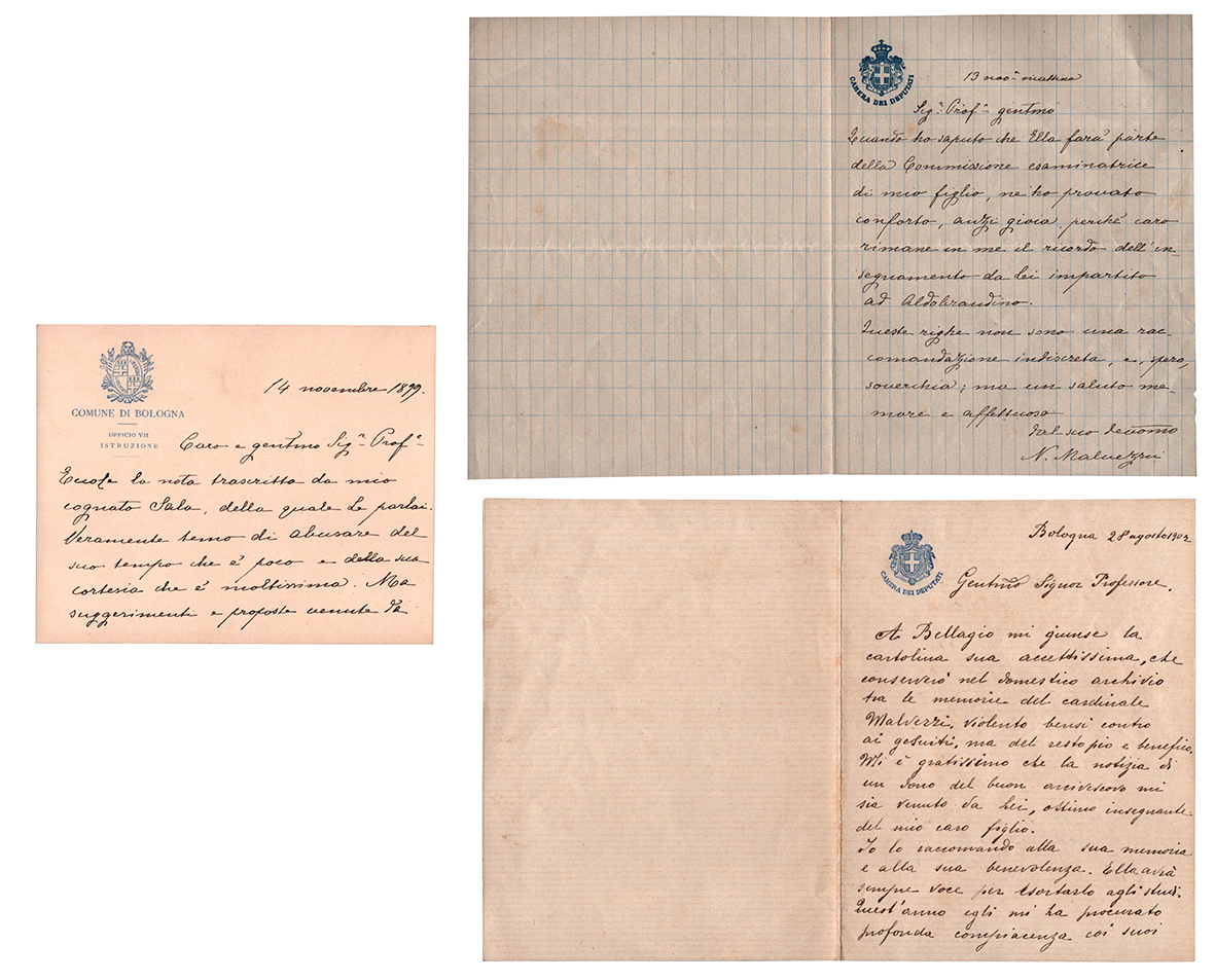 Dottore onorario del Collegio filologico, accademico onorario della Reale Accademia delle scienze, fu membro del Consiglio superiore degli archivi di stato e socio della Regia deputazione di storia patria per le province della Romagna. Senatore del Regno d'Italia dal 1909 al 1929. Grazie alla sua mediazione la casa e la biblioteca Carducci furono comprate dalla regina Margherita di Savoia e da essa donate alla città di Bologna. Tre lettere autografe firmate (solo due recanti anno: 1899 e 1903), indirizzate ad un professore. Riportiamo un passo a titolo di esempio. "A Bellagio mi giunse la cartolina sua accettissima, che conserverò nel domestico archivio tra le memorie del cardinale Malvezzi, violento bensì contro i gesuiti, ma del resto pio e benefico. Mi è gratissimo che la notizia di un dono del buon arcivescovo mi sia venuto da lei, ottimo insegnante del mio caro figlio. Io lo raccomando alla sua memoria e alla sua benevolenza. Ella avrà sempre voce per esortarlo agli studi...". Per un totale di 6 pagine in diverso formato, carta intestata.