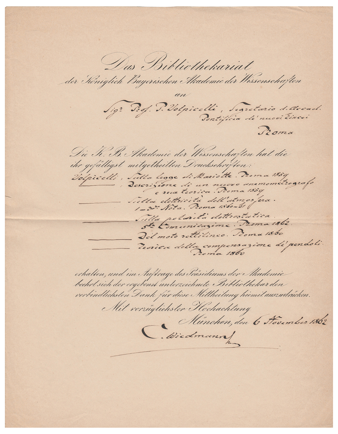 Paolo Volpicelli, professore di fisica sperimentale dal 1845, poi di fisica matematica nell'Università di Roma, fu membro segretario dell'Accademia Pontificia dei Nuovi Lincei e autore di studi di elettrologia, sul magnetismo, e sulla teoria dei numeri. Lettera a stampa (in parte manoscritta) datata 'Munchen 6 Novembre 1862', indirizzata al fisico, circa alcuni volumi del Volpicelli acquisiti dalla Biblioteca dell'Accademia bavarese delle scienze, presso Monaco.