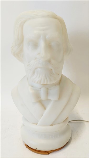 Lampada da tavolo in plastica bianca raffigurante il busto di Giuseppe Verdi. I