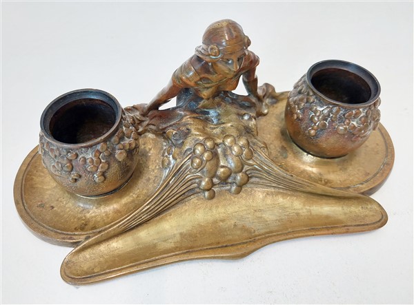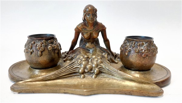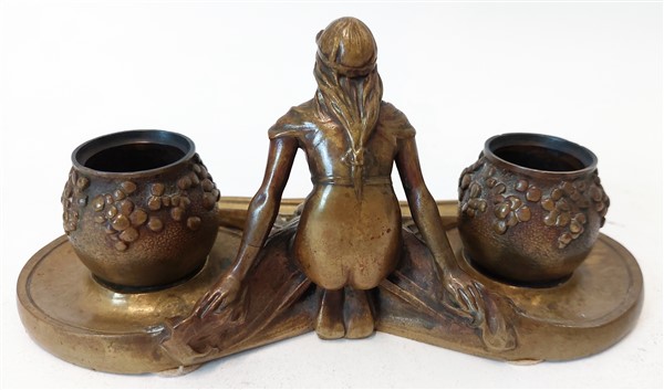 Calamaio Art Nouveau in fusione di bronzo con figura femminile inginocchiata e decori floreali. Inizio secolo XX. (cm 22x10) (difetti)