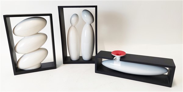 Lotto composto da tre sculture in ceramica bianca lucida entro supporto ligneo verniciato nero e opaco. Italia, 1964. Firmati "P.A Crespi" e datati. (h max cm 32)