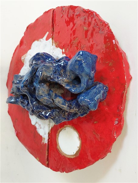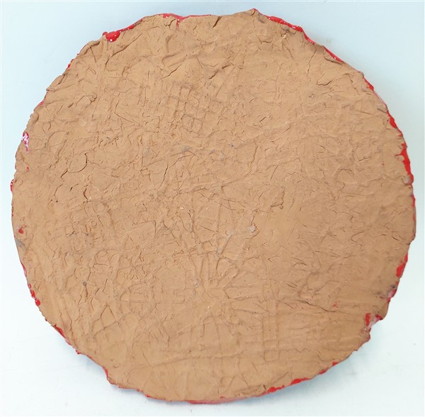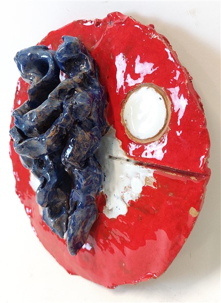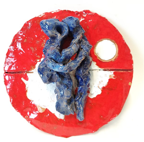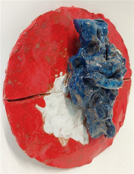 Tondo in terracotta decorato a graffito e a rilievo con coppia di figurine antropomorfe, smaltato in rosso, bianco e blu sotto vetrina. Italia, secolo XX. (d cm 22) (lievi difetti)