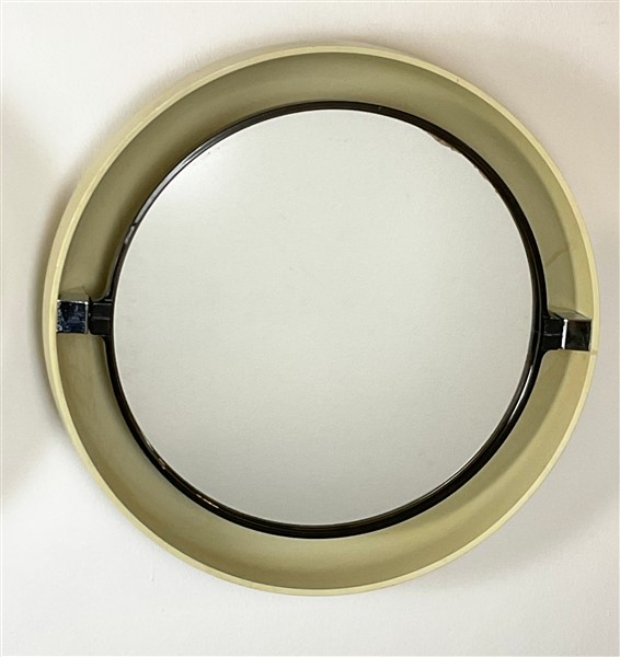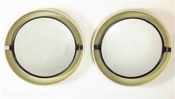 Coppia di specchiere rotonde retroilluminate e basculanti modello "Wand-leuchtspiegel a 41". Germania, anni '70. Plastica bianca e ambrata e vetro. Etichetta adesiva del produttore. (d cm 60,5) (difetti e mancanze)
