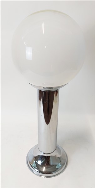 Lampada da appoggio in metallo cromato con diffusore sferico in vetro soffiato