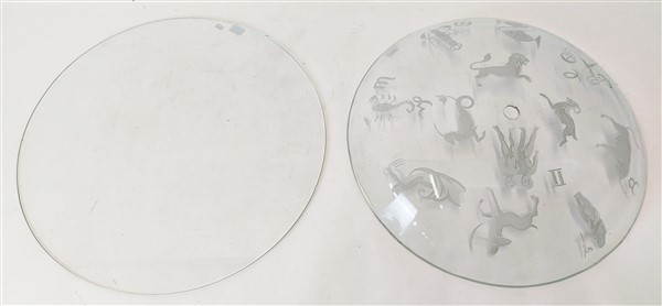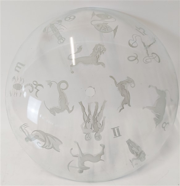 Parte di plafoniera in vetro inciso decorato con simboli dello zodiaco. Italia, secolo XX. Unito a un disco in vetro di diversa manifattura. (d max cm 50) (lievi difetti)