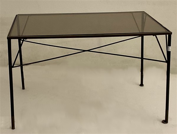 Tavolino da salotto con struttura in ferro e ottone, piano in vetro. Italia, seconda metà secolo XX. (cm 60x37,5x42,5) (difetti)